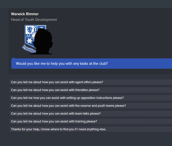 - Trening: Her deler jeg meg i to, i alle fall i starten. Assistenten får fritt spillerom til å sette opp trening for både lag og individuelle spillere, men kun for reserve- og ungdomslag. A-laget styrer jeg selv. Det kan nok være lurt å la assistenten styre alle lag i starten, og så gradvis ta over deler av treningsopplegget når man føler seg komfortabel.