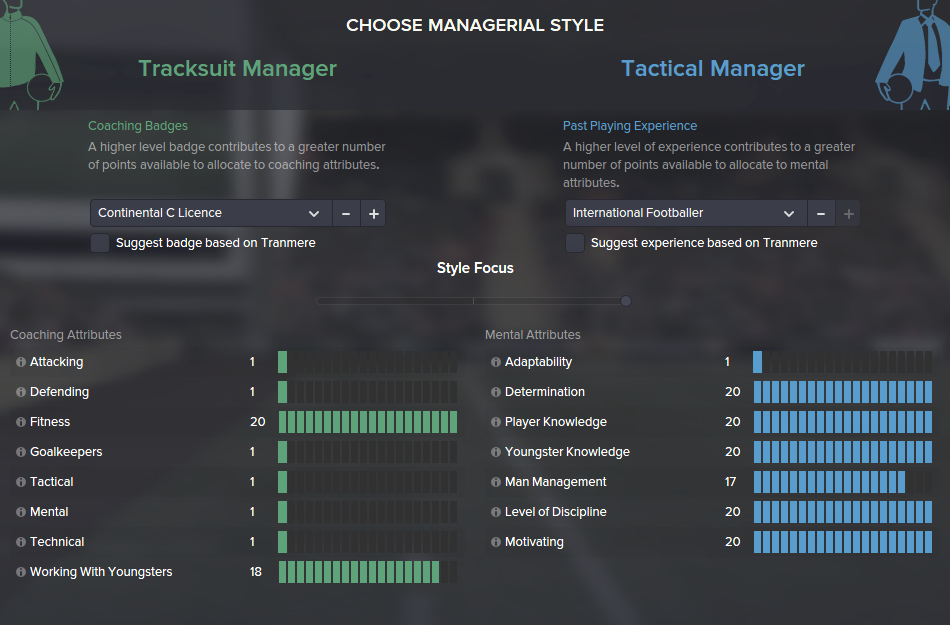 Etter å ha valgt klubb er det på tide å bestemme seg for hvilken rolle man skal ha i klubben. For lag med svak økonomi – generelt om man starter lengre nede i divisjonene – så kan det være lurt å være en såkalt joggedress-manager. En Nils-Arne Eggen-type, som kan være trener samtidig. Har man råd til å ansette folk til å gjøre dette, anbefaler jeg at man heller er en taktisk manager. Da får man putte poeng i områder som motivasjon, disiplin og målbevissthet. Dette vil gi deg fordeler i interaksjoner og hendelser både med spillere og styret.