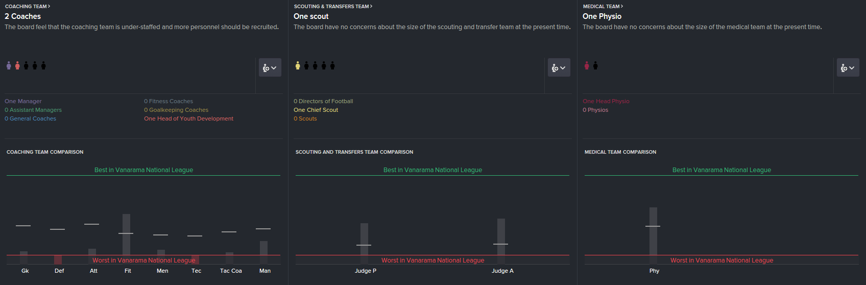 - Assistent-manager: Må ha grei peiling på vurdering av spillere og talenter. Her må man også vurdere om assistent-manageren skal trene spillerne i tillegg. Dette er gjerne et må-ha i lavere divisjoner for å spare penger. I tillegg ser jeg på hvor god han er å motivere, og om han er disiplinert.