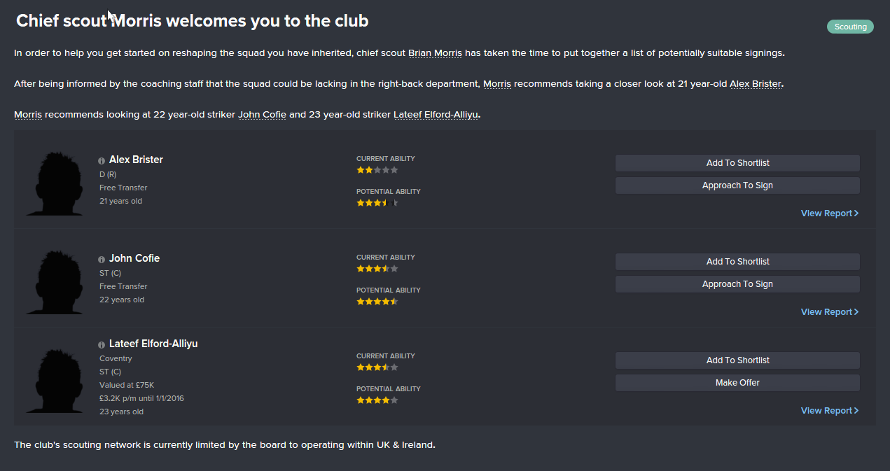Hvis klubben har en sjefsspeider, får man gjerne opp en personlig melding fra han med noen spillere som er verdt å se nærmere på. Disse er gjerne speidet godt allerede, så jeg bruker å legge disse til på min hurtigliste i første omgang, uten å se så nøye på dem. Årsaken er at jeg først vil danne meg en oversikt over spillerne jeg råder over, og hvilke posisjoner og spillertyper jeg mangler.