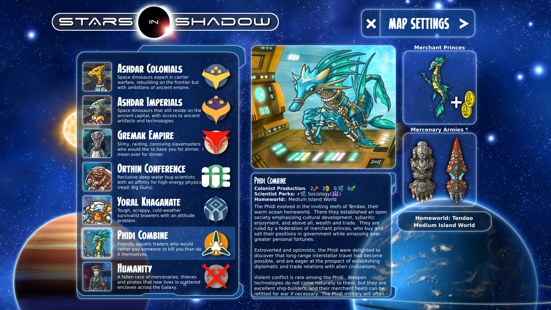 Totalt er det seks raser i spillet, men disse starter ikke helt likt. Det er nemlig tre «unge» raser, som er på vei til å ta sine første skritt ut i verdensrommet, og tre «gamle» raser som har overlevd en massiv stjernekrig, og fortsatt misliker hverandre. Interessant nok er «de nomadiske menneskene» en av de gamle rasene.