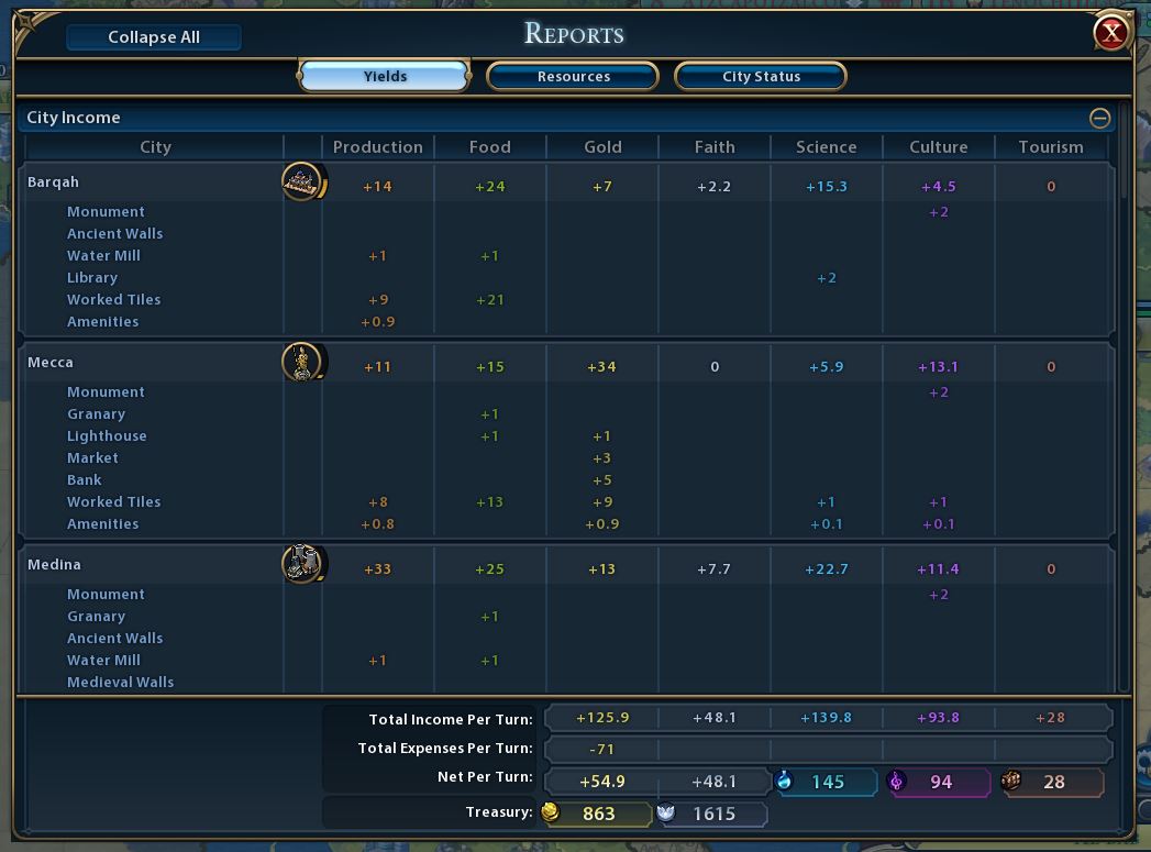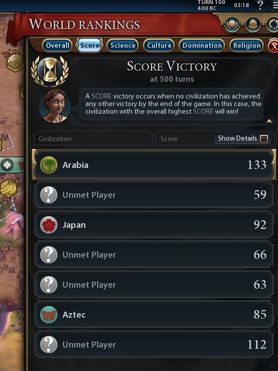 Omgang 132 kommer, og vi får endelig en profet, noe som gjør at vi kan grunnlegge islam! Profetens navn er dog ikke Muhammed, men Irenaeus. I vår tidsregning var han en kristen, men her er vi i et alterativt univers må vite. For islam velger vi som trosgrunnlag religiøse samfunn, som gir oss +1 tillatte innbyggere per religiøs bygning. I tillegg velger vi forvaltning, som gir oss +1 gull og +1 vitenskapspoeng for hvert vitenskapsdistrikt (campus) og kommersielle distrikt (commerical hub).