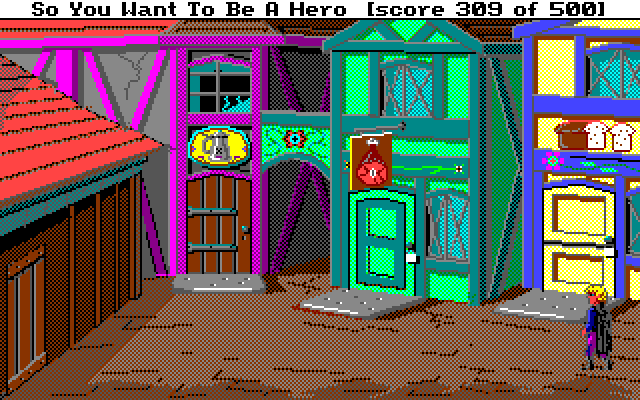 Quest for Glory bruker EGA-grafikkmodusen, som innebærer at det kun kan være 16 farger på skjermen samtidig. EGA har egentlig en fargepalett på 64 farger, men problemet er at i den skjermmodusen spillutviklere flest brukte (fordi den var mest kompatibel), var man låst til 16 spesifikke farger. Dette gjaldt altså uansett om spillet man laget skulle finne sted i verdensrommet, i middelalderen eller i storbyen. Hvis du har lurt på hvorfor magenta-fargen var så populær i PC-spill på åttitallet, er det altså derfor. Når man kun har 16 farger, kan man ikke være kresen.