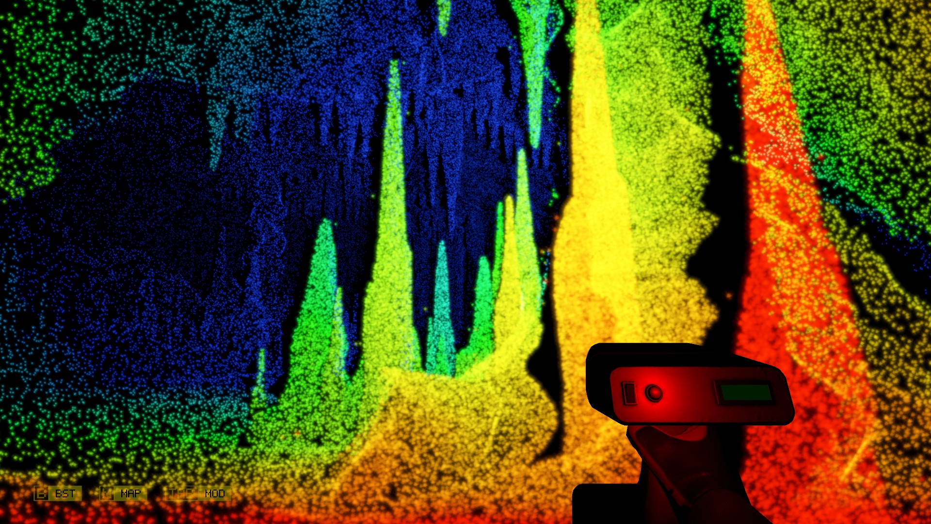 Tenk deg at du befinner deg i et dypt hulesystem uten lyskilder, men der du har mulighet til å visualisere omgivelsene dine ved hjelp av et avansert lidar-system. Du har en slags pistol som skyter laserstråler. Når hver av disse treffer en hulevegg, reflekteres de tilbake og treffpunktet registreres og visualiseres som liten prikk av glødende lys. Pistolen skyter ut store mengder slike stråler, så i praksis ser det ut som du gradvis spraymaler veggene med små lysprikker. Jo lenger du holder inne museknappen, jo mer «maler» du. På den måten forvandler du de totalt usynlige omgivelsene til noe du kan se og tolke.