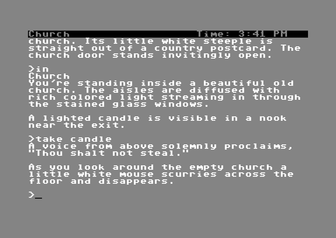 Det hjelper godt at kommandosystemet inkluderer rikelig med hendige forkortelser, og dessuten slippe å ha en spillfigur som må vandre langsomt over skjermen for hvert «rom» du skal gjennom. Tekst har sine fordeler!