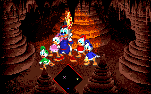 Huleutforsking er en helt annen greie. Her må hele gjengen, med Skrue i sentrum, navigere seg gjennom labyrintaktige huler på jakt etter en skatt. Hvert rom i hula dekker en hel skjerm, med mulighet for utganger i hvert hjørne. Hovedfaren her er fallgruber, samt en hissig mumie på andejakt. På et lite minikart kan du se hvor du er i forhold til både mumien og skatten, men du kan ikke se fallgrubene. Disse vil imidlertid alltid befinne seg vegg i vegg med rom markert i grønt, så det er mulig å forsøke å planlegge ruten etter hvor det er minst sannsynlig å treffe på slike hindringer. Men du kan ikke bruke alt for mye tid på planleggingen, for mumien vandrer målrettet fra rom til rom, i din retning. På høyere vanskelighetsgrader viser minikartet mindre informasjon.