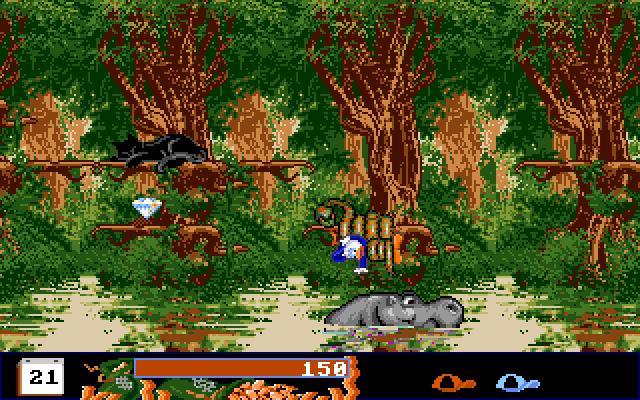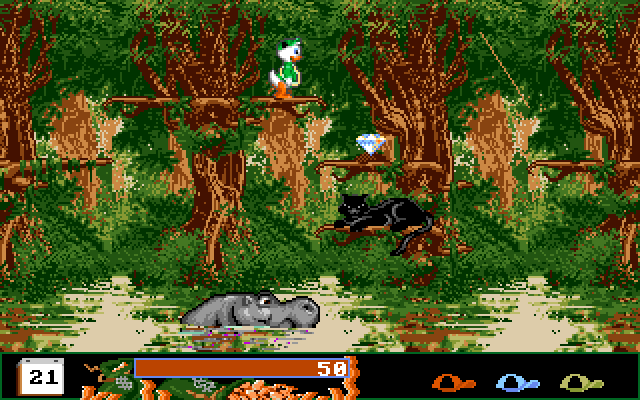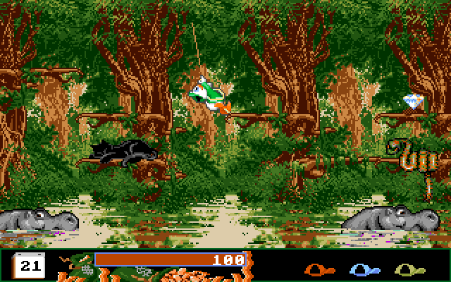 I bunnen av skjermen er det ei elv, og du kan spare litt tid ved å slippe deg ned på ryggen til svømmende flodhester og kjempeskilpadder som tilfeldigvis skal i samme retning som du. Men det er ikke direkte trygt, for de kan finne på å dykke – og du kan ikke svømme. Også her er det Ole, Dole og Doffen som er hovedpersonene, og de fungerer igjen som tre forskjellige liv.