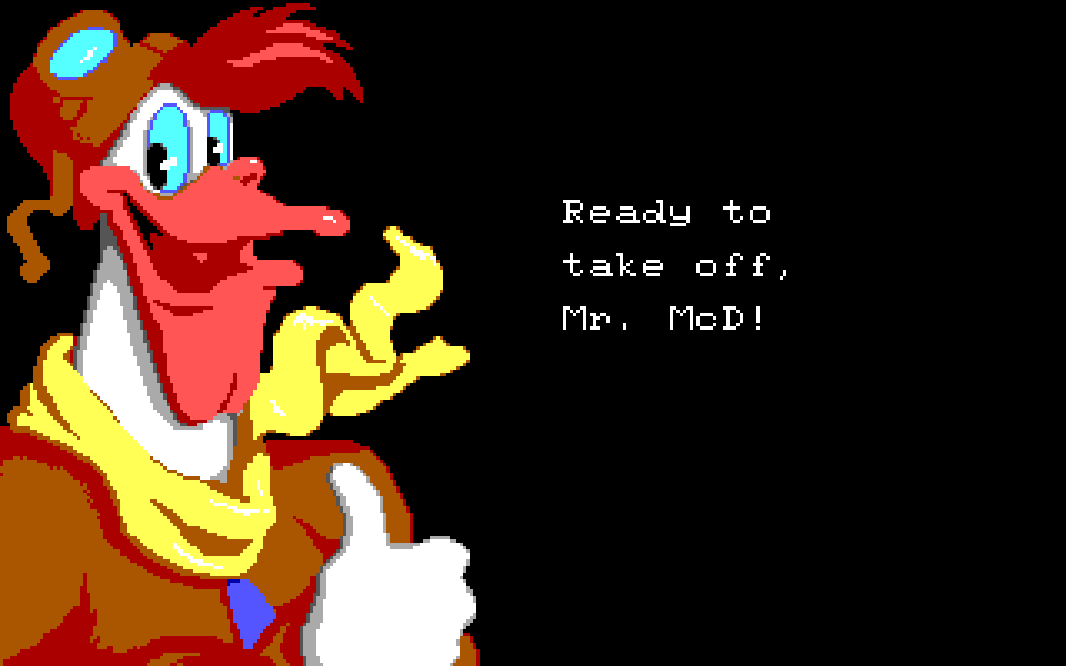Flyets pilot er Rotor McKvakk, en karakter som ble skapt for DuckTales-serien, og som generelt gjør en heller dårlig jobb med å få passasjerene sine trygt frem. Men det er ikke hans skyld, ettersom reisen – som fungerer som en sideskrollende sekvens der du skal komme deg fra venstre side av spillbrettet til høyre – stadig avbrytes av hindringer. Disse inkluderer tordenskyer, master man naturligvis ikke kan fly rundt, og hvaler som av en eller annen grunn spruter vannsøyler etter deg. I tillegg flyr B-gjengen rundt i varmluftsballonger fulle av hvitevarer og annet svineri, som de slipper ned fra kurven om du forsøker å fly under dem.