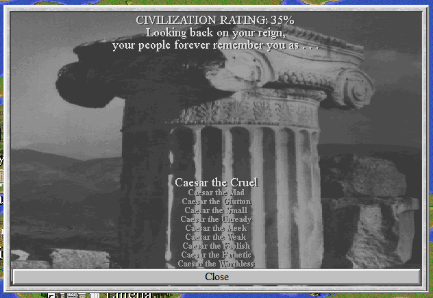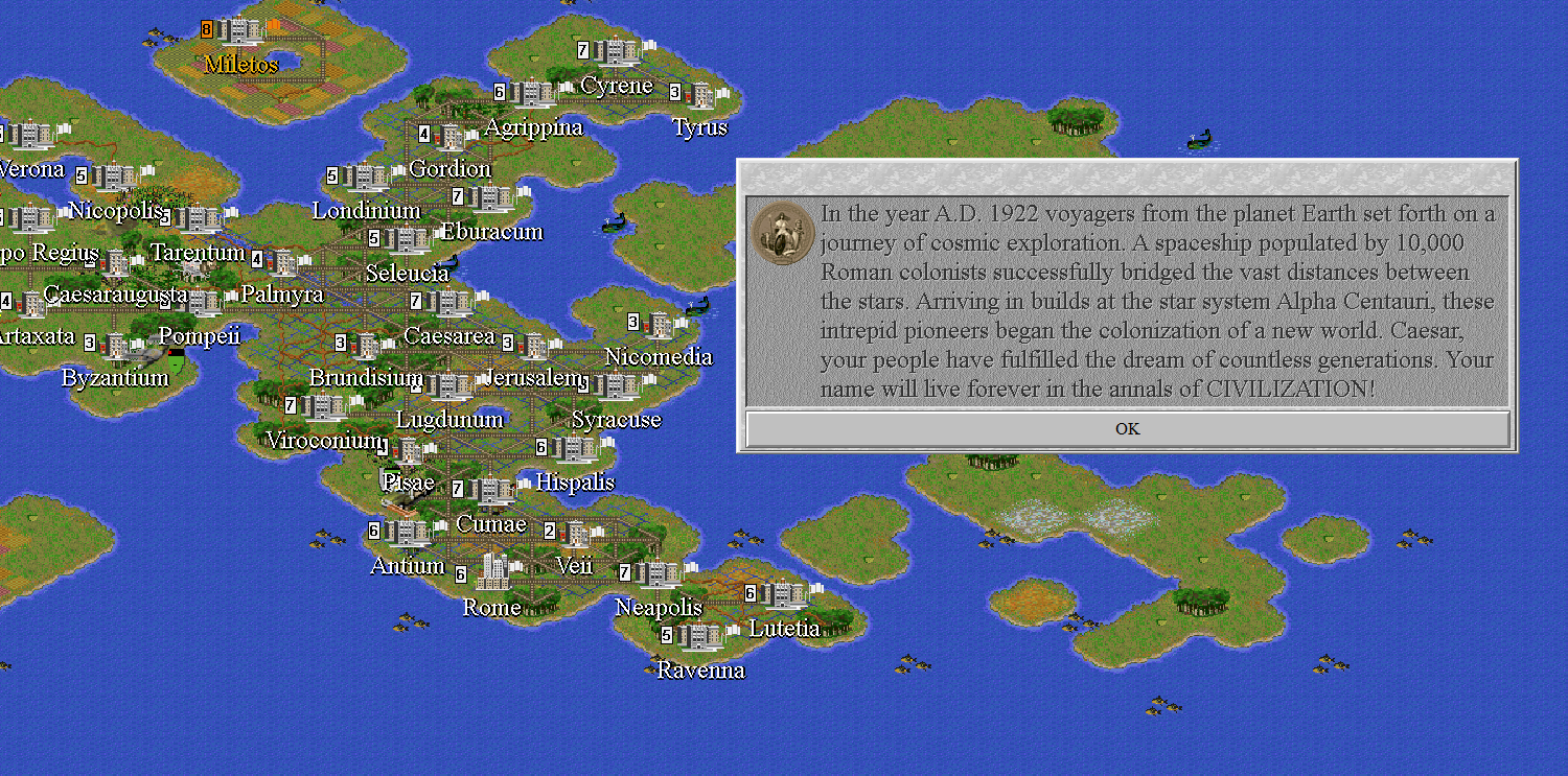 Og da jeg traff de andre sivilisasjonene skjønte jeg at her ble det ikke lett å vinne. De var alle langt mer avanserte enn meg. Heldigvis var de i krig med alle rundt seg, og lot meg være i fred. Jeg fylte kontinentet mitt, satset alt på økonomi og teknologi, svettet litt da jeg så hvor nære AIen var romskipsteknologiene, som man trenger for å vinne vitenskapelig. Og hvor langt unna jeg var. Men AIen er…dum. Jeg rushet Apolloprogrammet, som ingen av motstanderne hadde giddet å bygge, og mens de andre bygde sakte på romskipene sine, satte jeg store deler av byene mine til å produsere romskipdeler. Og i 1922 sendte jeg et koloniskip mot Alpha Centauri. Femten år senere vant jeg, mens datamotstanderne lå der i støvet, slått ned i støvlene av mine overlegne ferdigheter. Ahem. Jeg fikk ikke mye poeng, jeg gjorde det rett og slett veldig dårlig i forhold til hva jeg kunne før. Men jeg VANT!