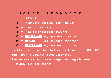 Commodore 64 hadde ikke norsk tegnsett, men dette vesle programmet endrer noen av de eksisterende tegnene til æ, ø og å. Dermed kan du skrive med norske tegn, riktignok på en litt klumsete måte. Men det funker. Mystisk nok frigjør dette programmet også like over én kilobyte av minnet til maskinen, slik at du får litt ekstra plass å rutte med når du jobber i BASIC eller kopierer filer.