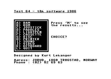 Dette er et artig lite testprogram som kan hjelpe deg å finne problemer med Commodore 64-maskinen din, ved å utføre ulike tester på alt fra skjermen til diskettstasjonen. Det er laget av Kurt Lekanger, som er et navn du bør kjenne igjen om du har lest Hardware.no/Tek.no i årenes løp (han er nå redaksjonssjef i Digi.no).