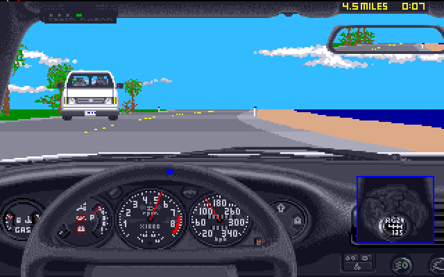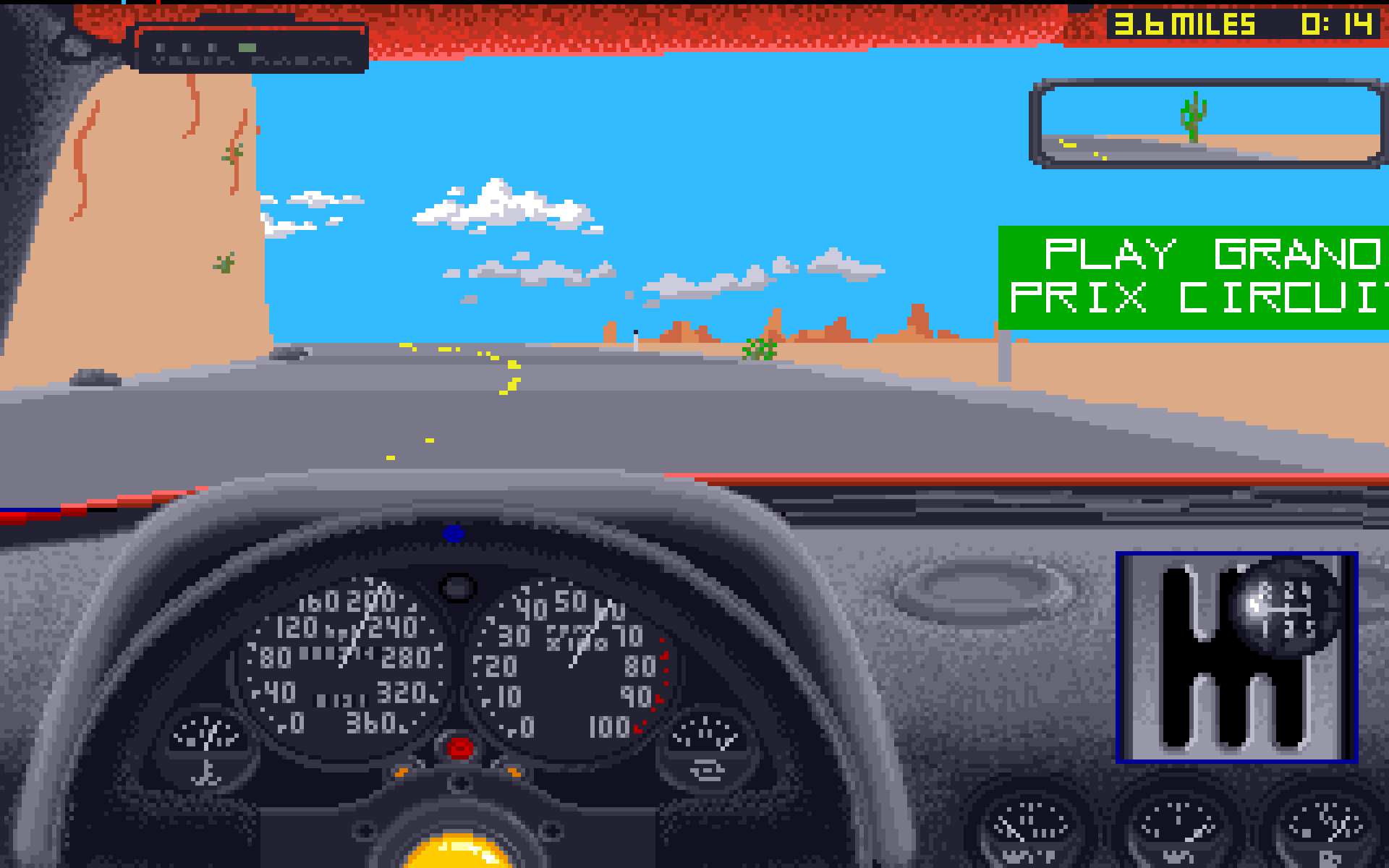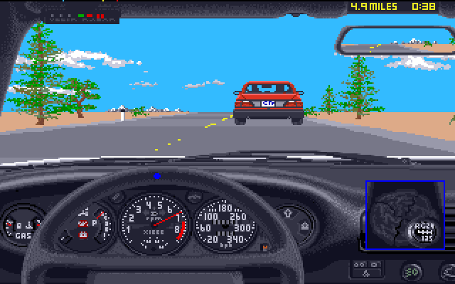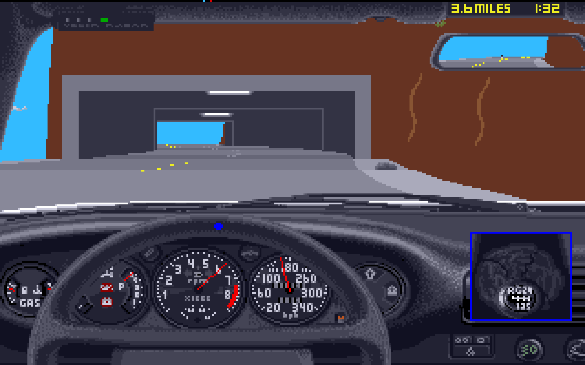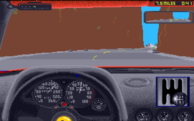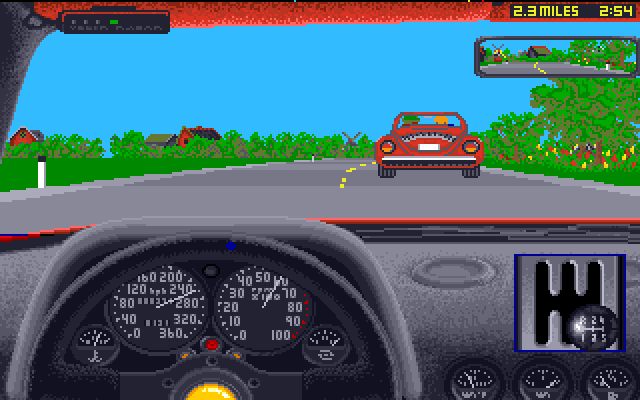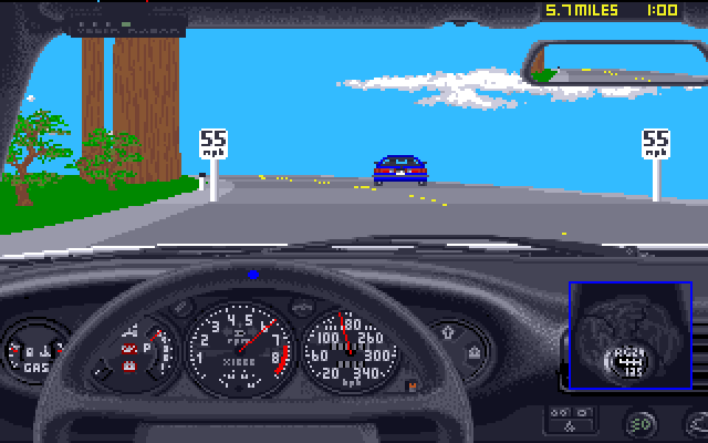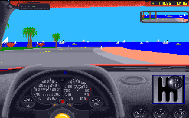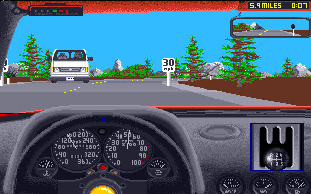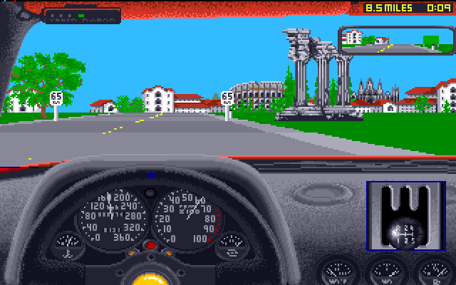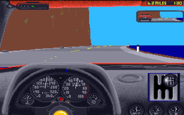 Det første som imponerte meg med Test Drive II var synsvinkelen. Her fikk vi ikke den tradisjonelle «bak bilen»-vinkelen til de klassiske arkaderacerne, i stedet ble vi plassert rett i førersetet. Foran oss hadde vi ratt, frontrute og et realistisk dashboard med speedometer, turtallsmåler og det hele. Til og med bakspeilet var med, og det fungerte! Instrumentpanelet var heller ikke bare til pynt, for selv om spillet støttet automatgir, var det åpenbart at utviklerne mente vi burde gire manuelt. Og det var fullt mulig å ødelegge motoren hvis turtallet gikk for høyt.
