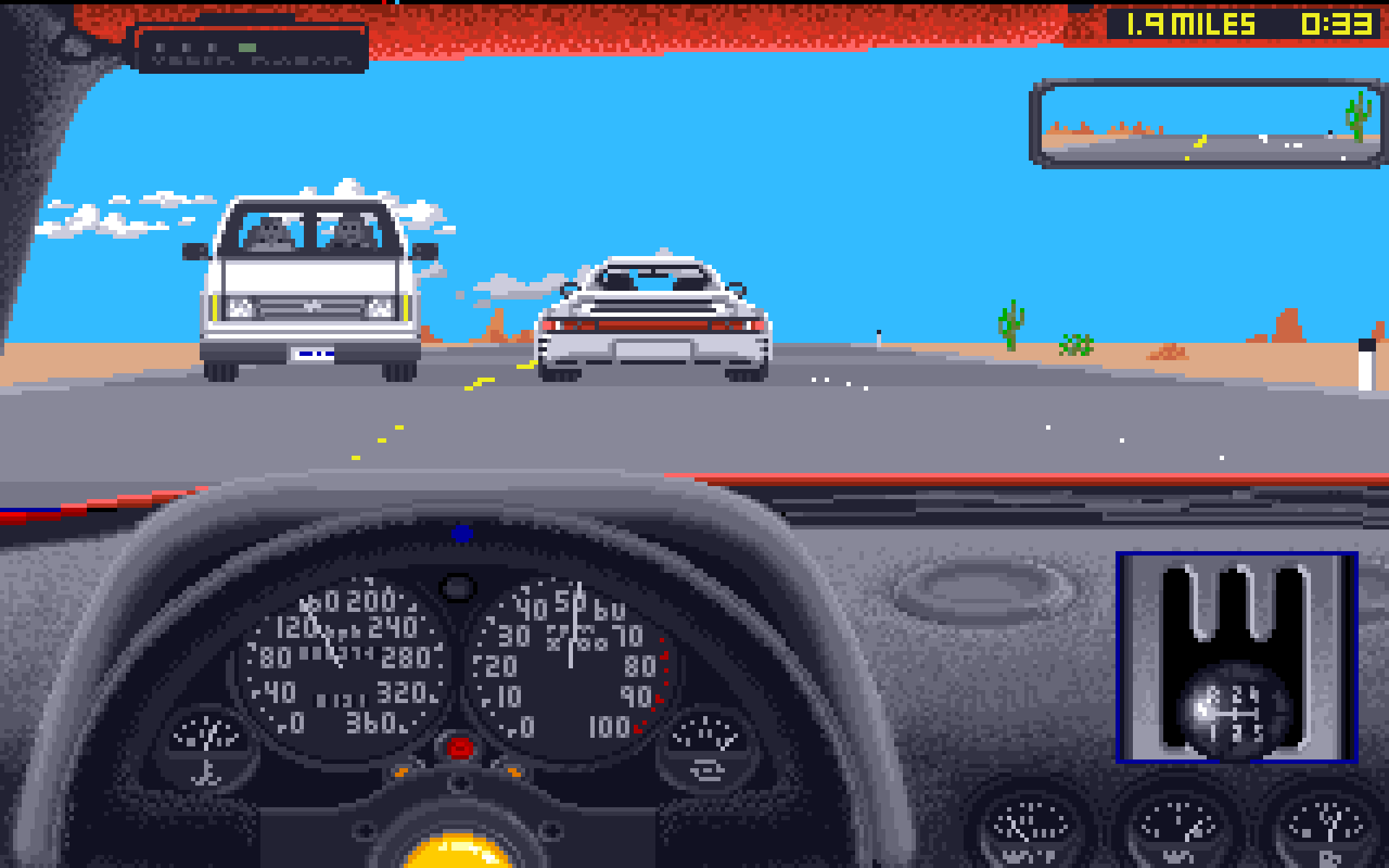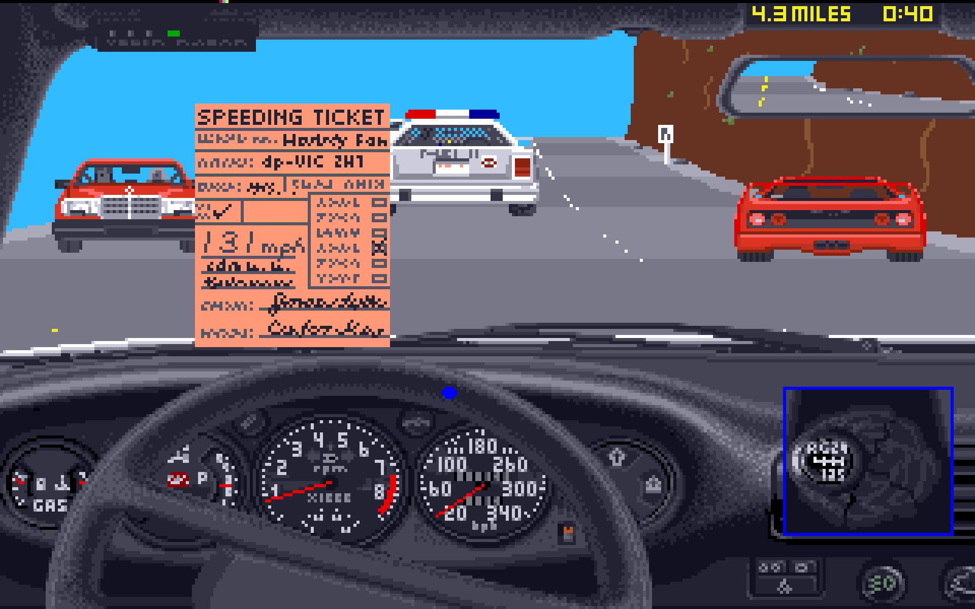 Dette, Street Rod og Grand Prix Circuit var mine favorittbilspill i lang tid. Husker jeg og en kompis prøvde å kjøre lovlydig gjennom hele spillet en gang for å se om man fikk en annen slutt, men vi gjorde en feil langt uti spillet, så vi klarte det ikke. Vi gadd aldri prøve på det igjen….