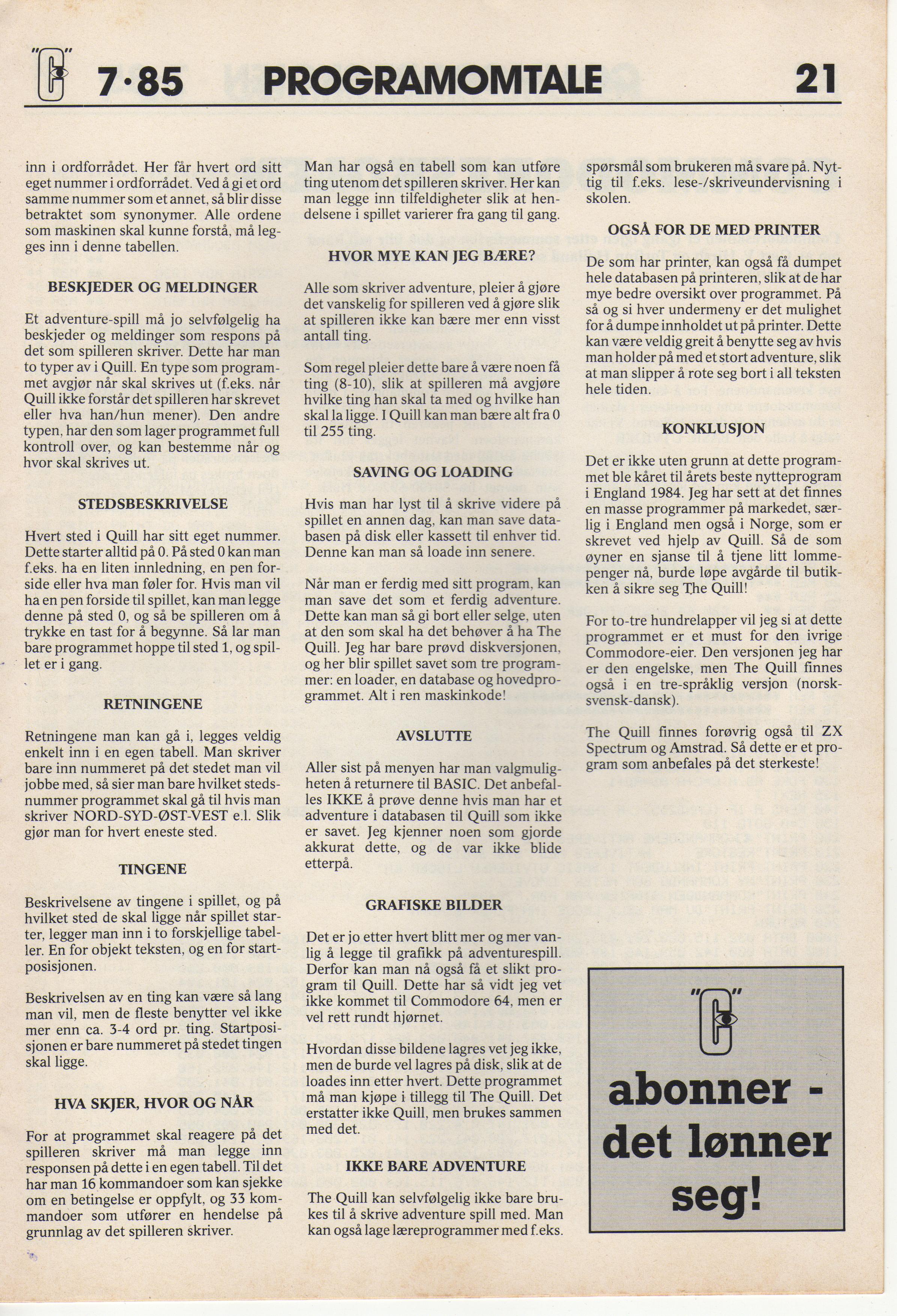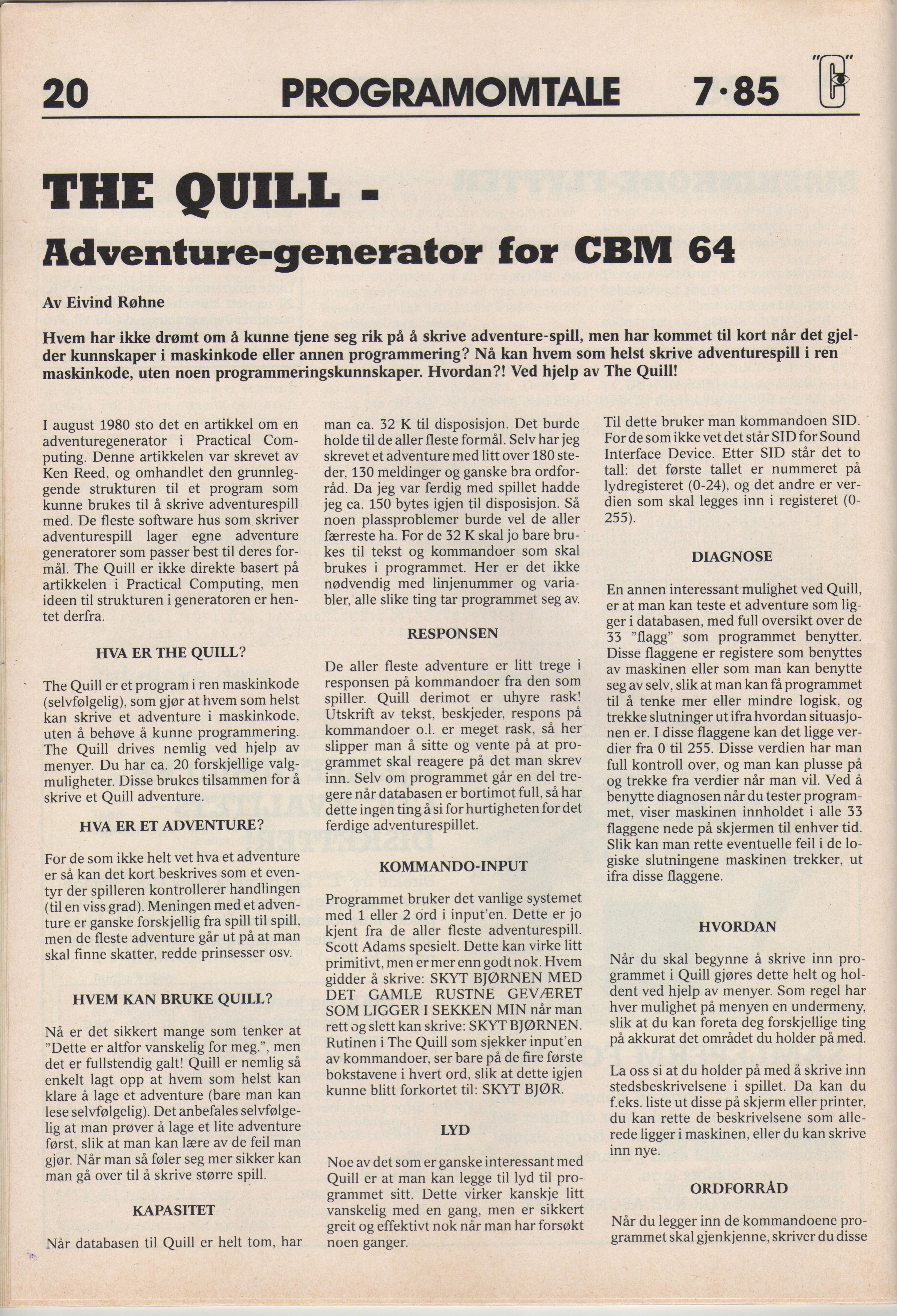 Her er en tekst om den norske versjonen av The Quill fra det dansk/norske bladet Med Blikket mot Commodore og MSX (husk at når du klikker på bildene, så kommer det opp en knapp som lar deg vise det i full størrelse):