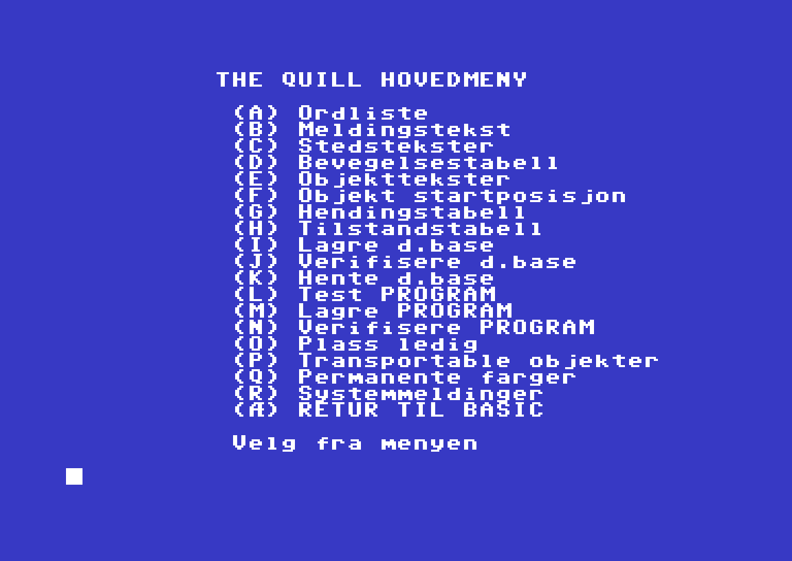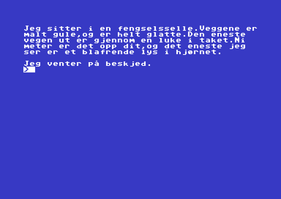 The Quill på norsk lar deg altså designe dine egne teksteventyr for Commodore 64, med norske verb og bokstaver. Verktøyet inkluderer et ettroms eksempelspill, der du er fanget i en celle. Jeg er usikker på om det lar seg fullføre.