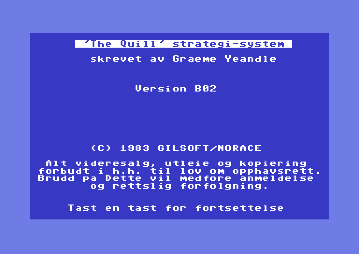 Ta gjerne kontakt om du har en kopi av Jungel Jakt, eller noen andre norske spill som ble laget ved hjelp av The Quill. Gnom (eller Gnomen Gimre) og to ZX Spectrum-spill (inkludert Prinsessa i berget det blå, som jeg faktisk «anmeldte» for BAF’s Guide i 2001) er så langt de eneste som er tilgjengelig på nettet. Ta også kontakt om du har mer kjennskap til Norace Computing.