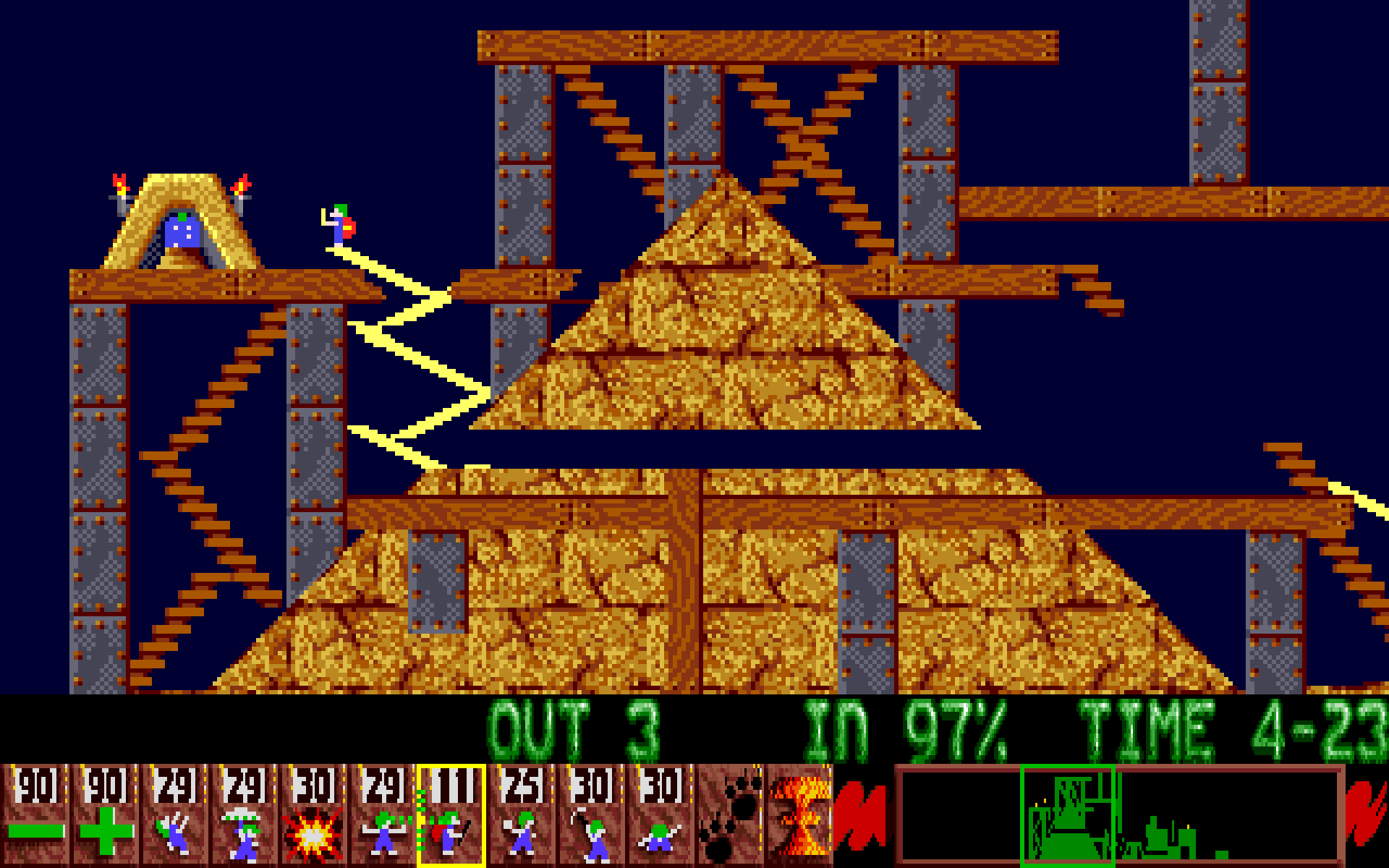 Det var nettopp slike ting som gjorde at jeg til slutt mistet tålmodigheten, og begynte å utnytte meg av emulatorens lagrefunksjon slik at jeg slapp å spille flere minutter om igjen hver gang Lemmings ga meg et solid ballespark. Hvis du spiller Lemmings uten mulighet eller samvittighet til å jukse slik, er jeg fristet til å anbefale deg å slutte å spille etter 90 brett. Bare fortsett om du har sadomasochistiske tendenser, og den merkelig spesifikke fetishen din er å bli ydmyket av androgyne småtroll med grønt hår.