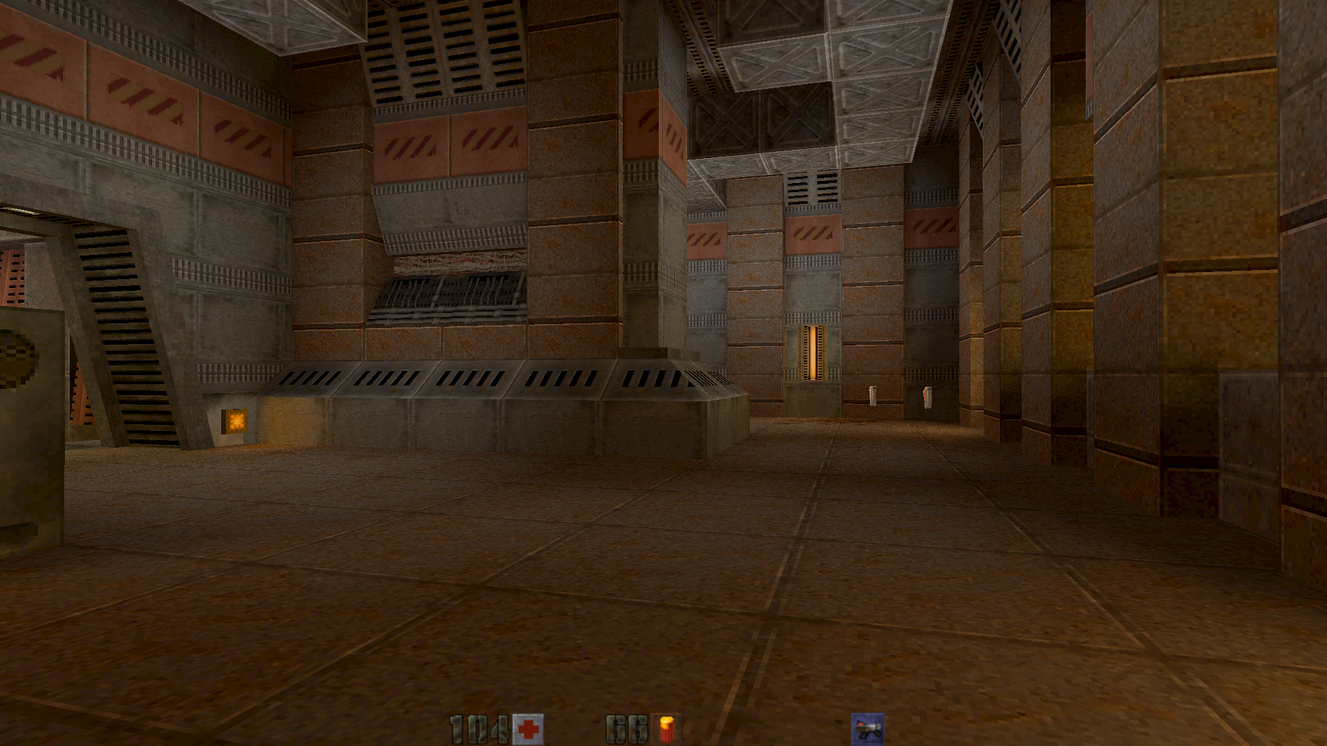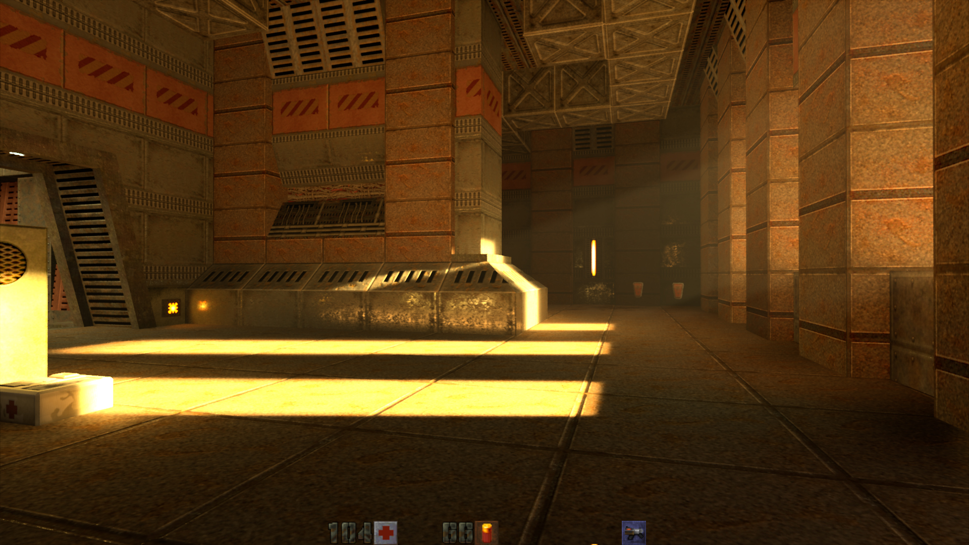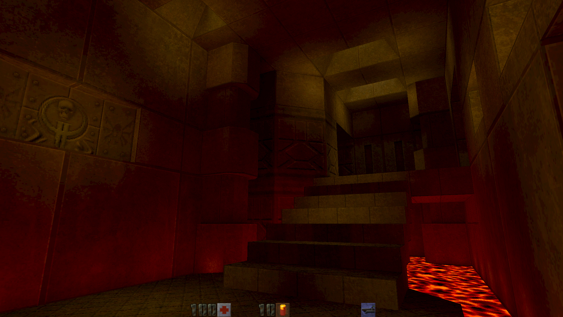 We’ve introduced real-time, controllable time of day lighting, with accurate sunlight and indirect illumination; refraction on water and glass; emissive, reflective and transparent surfaces; normal and roughness maps for added surface detail; particle and laser effects for weapons; procedural environment maps featuring mountains, sky and clouds, which are updated when the time of day is changed; a flare gun for illuminating dark corners where enemies lurk; an improved denoiser; SLI support (hands-up if you rolled with Voodoo 2 SLI back in the day); Quake 2 XP high-detail weapons, models and textures; optional NVIDIA Flow fire, smoke and particle effects, and much more!