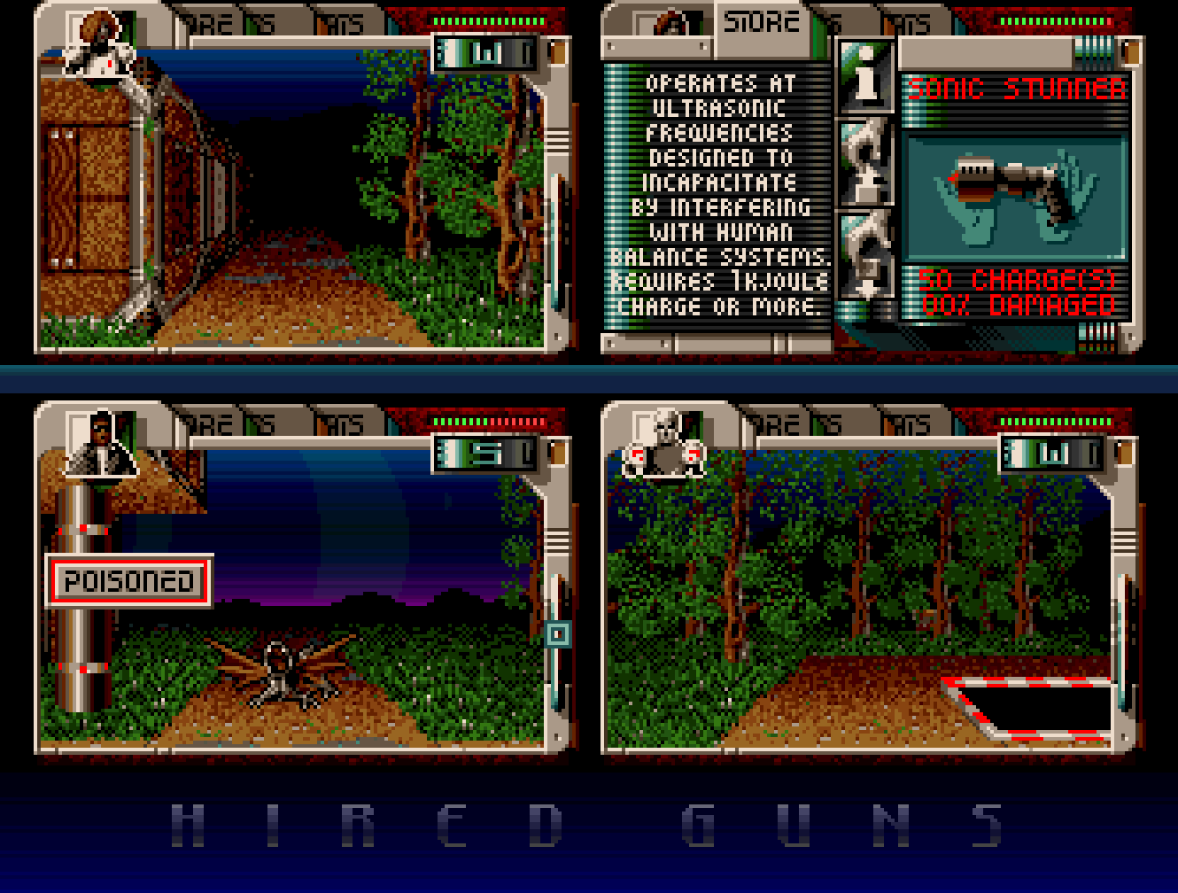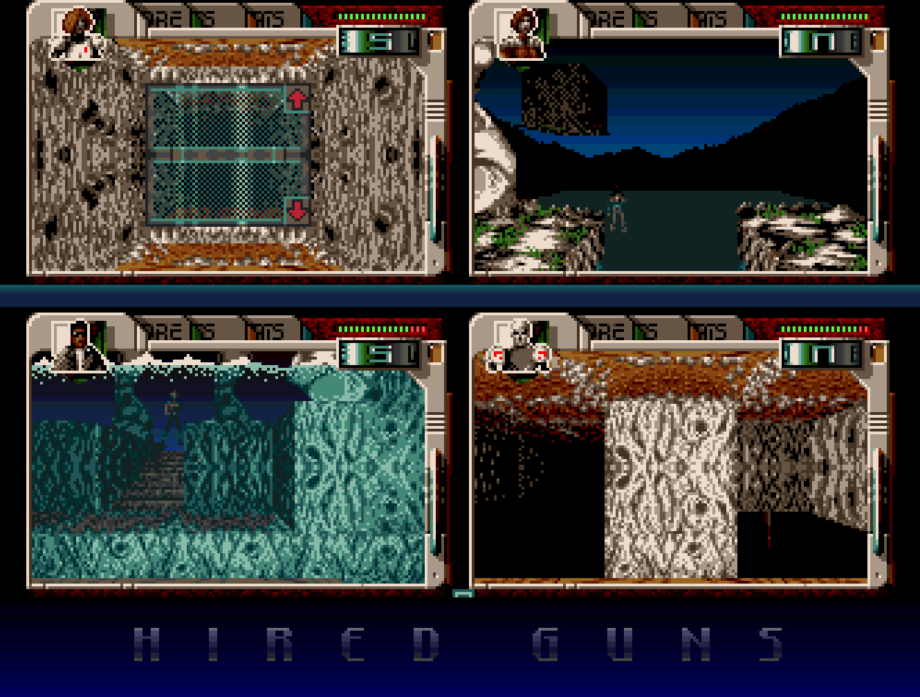 Hvis du har hørt om Hired Guns før, er sjansene store for at du eide en Amiga da det kom ut. Spillet kom både til Amiga og PC, men på PC gjorde det langt mindre ut av seg, selv om begge versjonene fikk en rimelig god mottakelse av spillpressen. Konkurransesituasjonen var nok en litt annen på PC, og grafikken bærer preg av at Amiga var hovedplattformen under utviklingen. Selv om PC-versjonens figurer er litt mer fargerike enn de på Amiga, ser spillet omtrent likt på begge plattformer, og en kan ikke akkurat anklage spillet for å utnytte seg særlig godt av VGA-standardens 256 farger. Dette skal ifølge et intervju med spillets hovedartist, Graeme Anderson, være et resultat av lite tid: