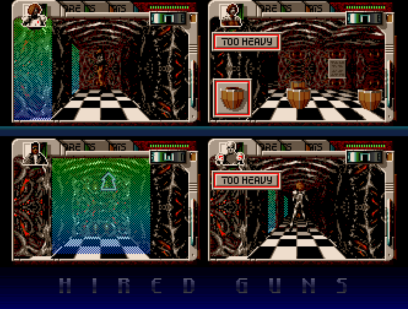 Hired Guns benytter seg av førstepersons synsvinkel, og styres på en måte som i utgangspunktet ikke virker helt ulikt kontrollsystemet tradisjonelle huleutforskingsspill som Dungeon Master og Eye of the Beholder. Kort sagt navigerer du figurene dine gjennom spillets miljøer som om de var brikker i et tredimensjonalt brettspill. De kan snu og flytte seg i fire forskjellige retninger, pluss opp og ned ved hjelp av heiser, trapper og, om du ikke er forsiktig, hull i gulvet eller stup.