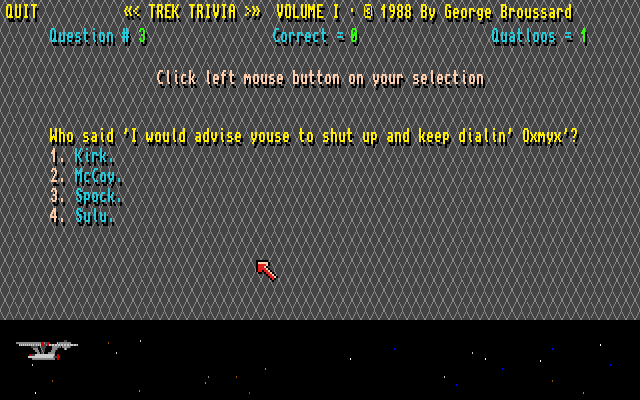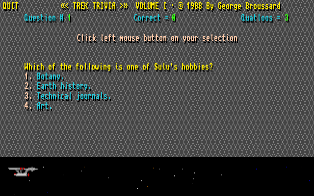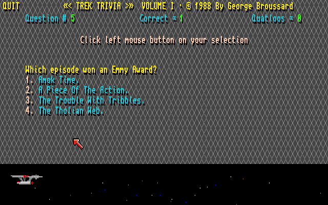 Trek Trivia er et «shareware»-spill fra 1988, som er akkurat hva det høres ut som – et trivia-spill der spørsmålene er hentet fra Star Trek. Dette er en gratisversjon som har 100 spørsmål, og om man virkelig likte spillet fantes det hele ni andre utgaver med ulike spørsmål som kunne bestilles direkte fra Broussard (som markedsførte spillet under navnet Micro F/X Software). Men om dette fortsatt var tilfelle sommeren 1991 er jo et helt annet spørsmål.