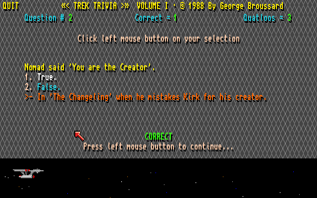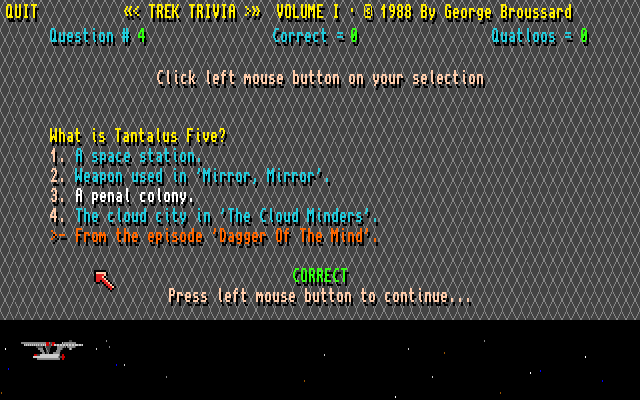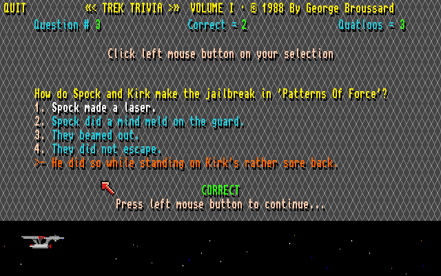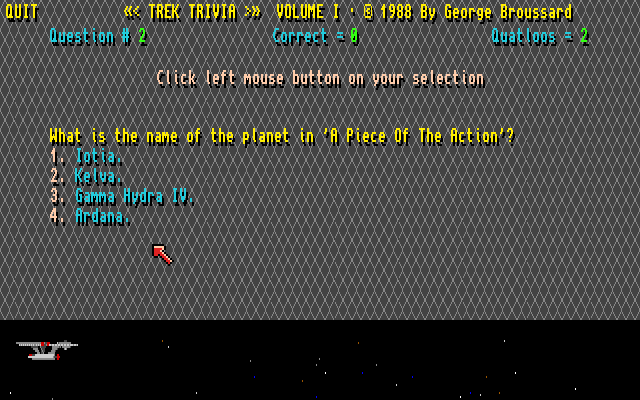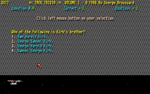 Da jeg startet Trek Trivia fikk jeg meg en rimelig stor overraskelse. Spillet ble nemlig skapt av George Broussard, et kjent navn for alle som fulgte med på PC-spill på nittitallet. Jeg hadde faktisk ingen anelse om at han hadde lagd noe for Amiga, og måtte dobbeltsjekke at det faktisk var den George Broussard det var snakk om her. Det var det altså.