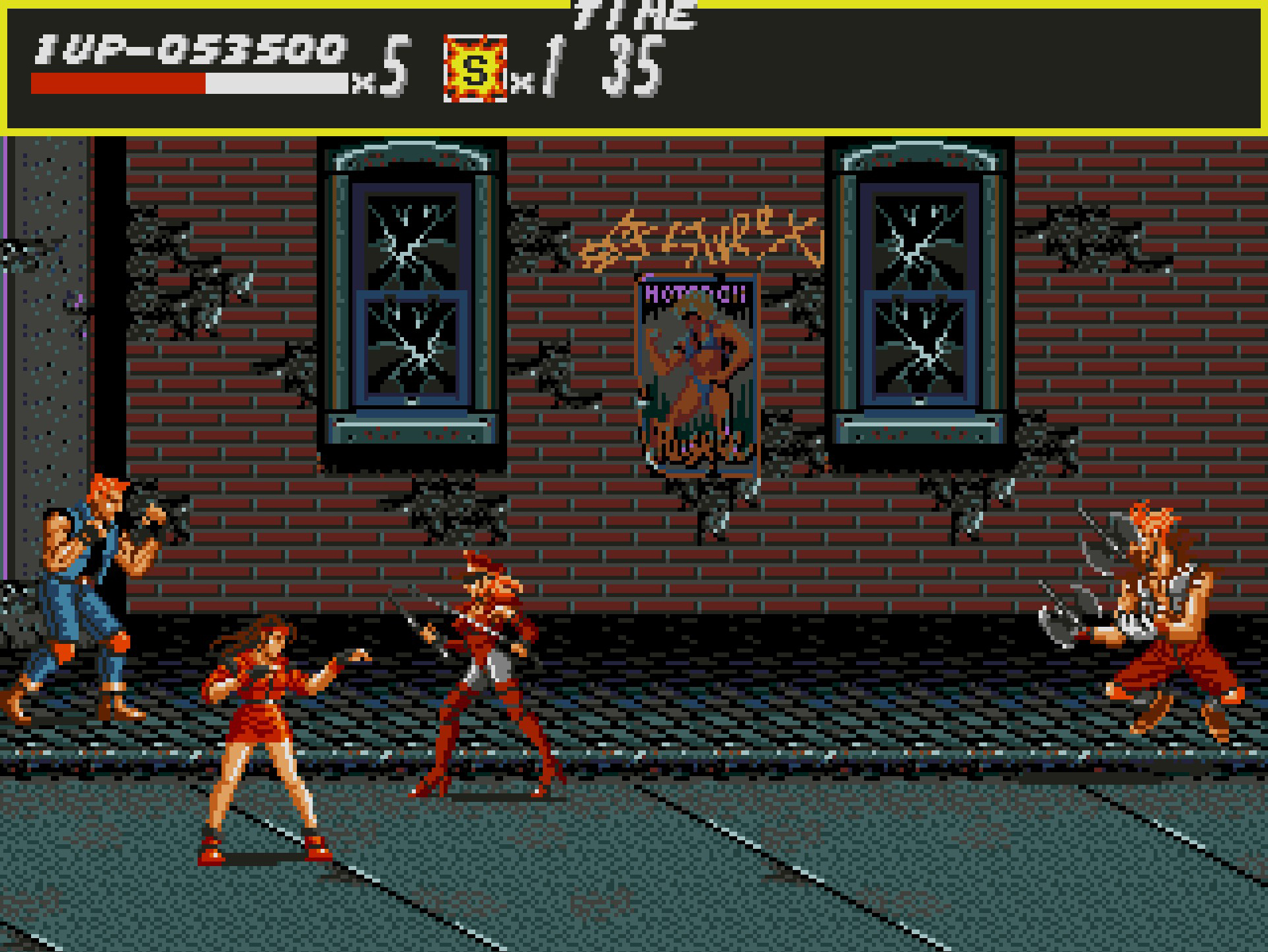 Første brett starter i en helt vanlig opplyst gate med masse butikkvinduer og parkerte biler. Gjengen til Mr X raver i gatene, og det nærmest blinker i kniver. Her kommer det til å gå hardt for seg. Fiendene er ikke treige med å introdusere deg for en knyttet neve og alskens våpen, som kniv, jernrør, øl flasker og balltre. Heldigvis for oss mister tøffingene verktøyet sitt ganske enkelt, så her er det bare å forsyne seg.