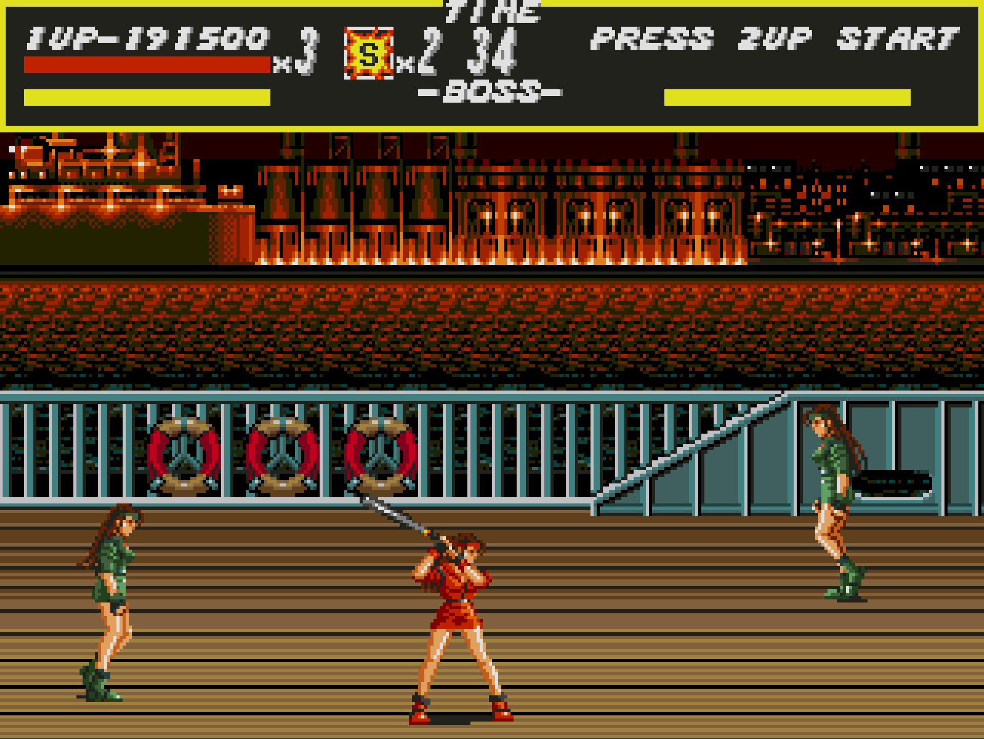 Alle bossene har hvert sitt bevegelsesmønster, og etter noen forsøk lærer du hvordan du best kan håndtere dem. Men fra og med brett nummer fem er du så heldig at du får møte på to bosser samtidig, og de av oss som har spilt Streets of Rage husker nok tvillingene her så alt for godt. Du må regne med litt prøv og feil, for disse damene kan rive gjennom liv og forsøk på null komma niks.