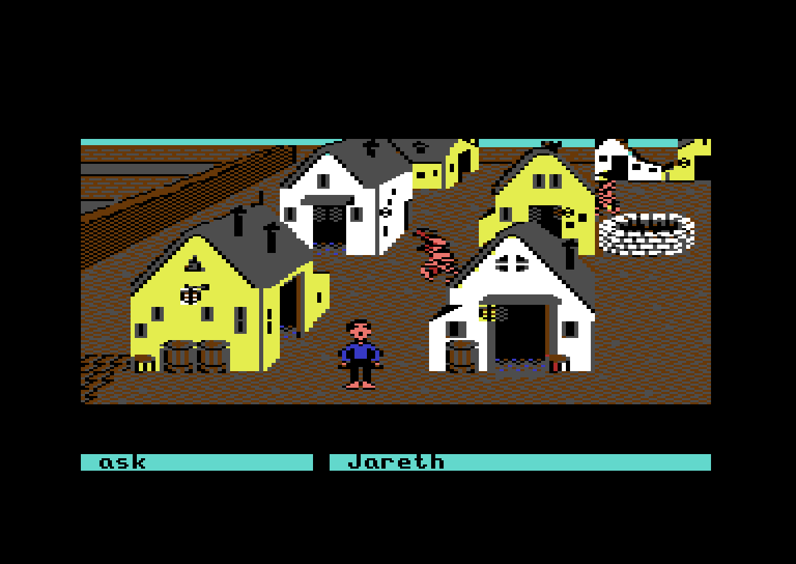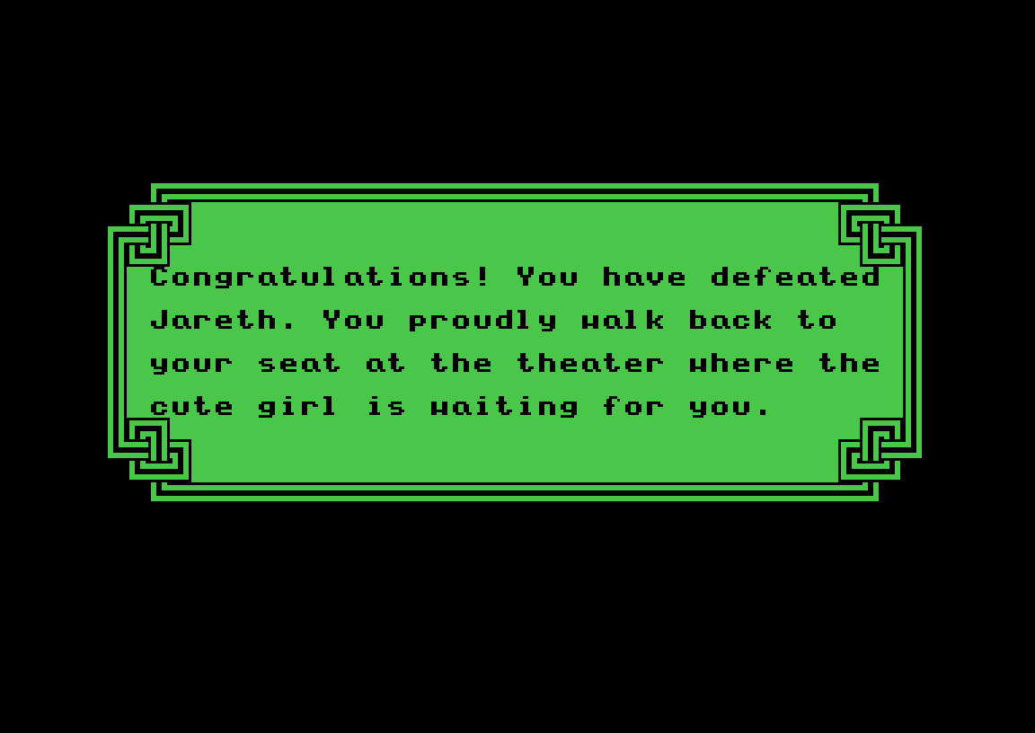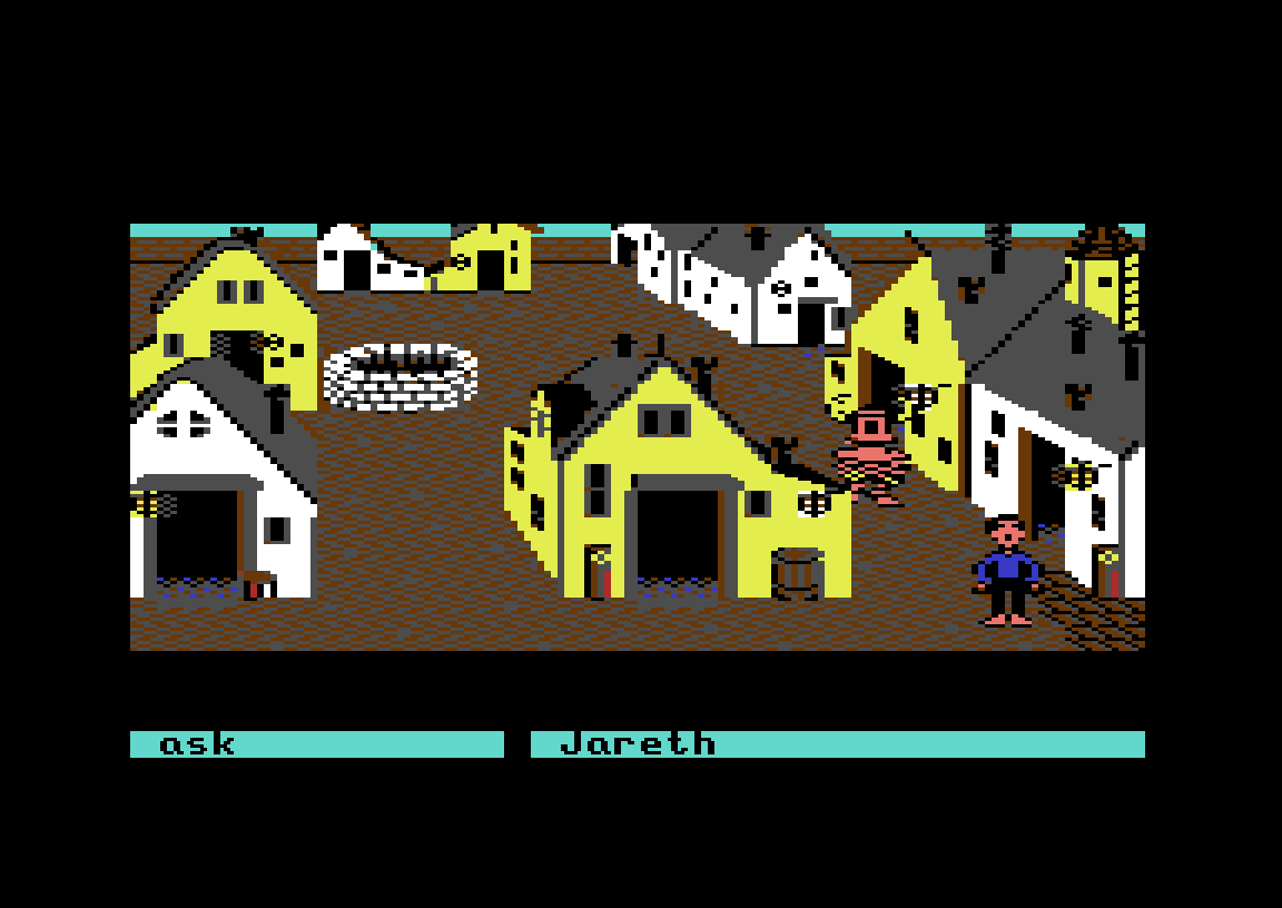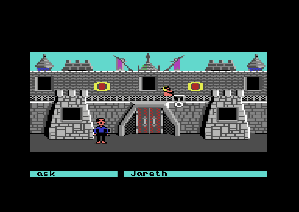 Eventyrspillet Labyrinth, som kom til Commodore 64 og Apple II i 1986, har et lignende øyeblikk. Det hele starter som et vanlig teksteventyrspill, skjønt med et grensesnitt der man velger ord i stedet for å skrive dem. Du spiller «deg selv» – det første du gjør er å skrive inn navn, kjønn og favorittfarge – og målet i starten er rett og slett å se filmen Labyrinth på kino.