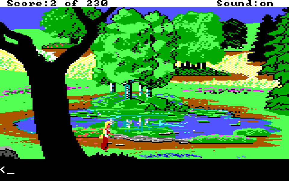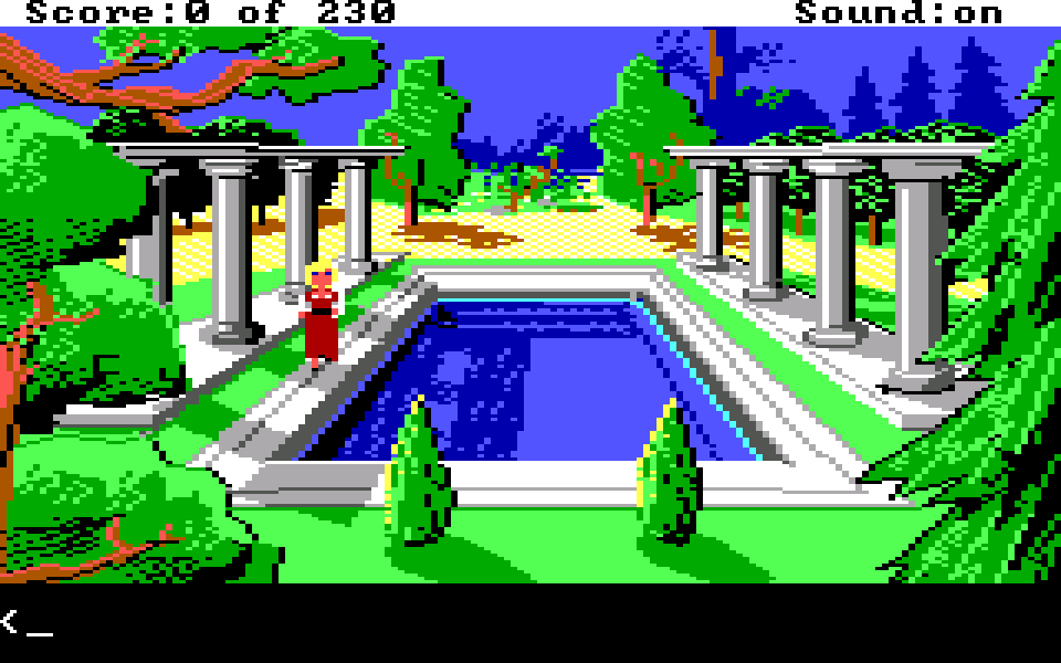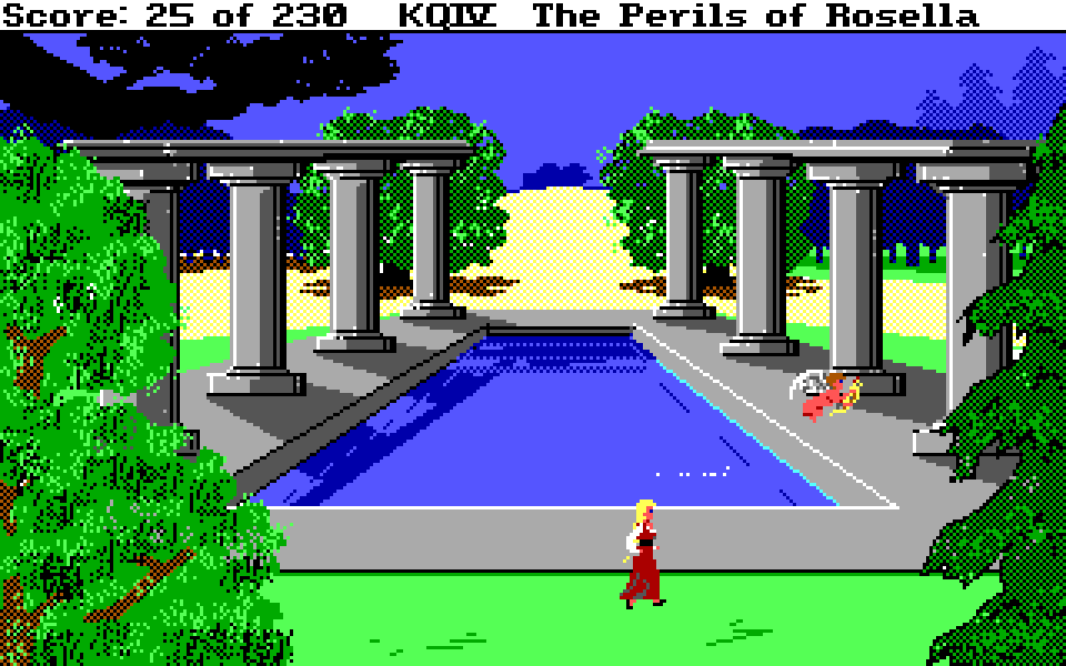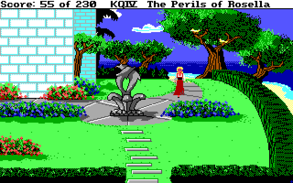 Legg forøvrig merke til at noen av bildene fra den gamle motoren har litt ulike detaljer – bassenget har for eksempel to ekstra busker, og i bildet under er treet i forgrunnen lysere der. Dette er fordi den versjonen som er til salgs i dag (og som jeg har spilt) ikke er den originale utgaven av King’s Quest IV, men en versjon som gjennomgikk noen justeringer samtidig som spillet ble lansert for Amiga og Atari ST. Så buskene foran bassenget ville for eksempel vært til stede om du kjøpte standardversjonen i 1988.