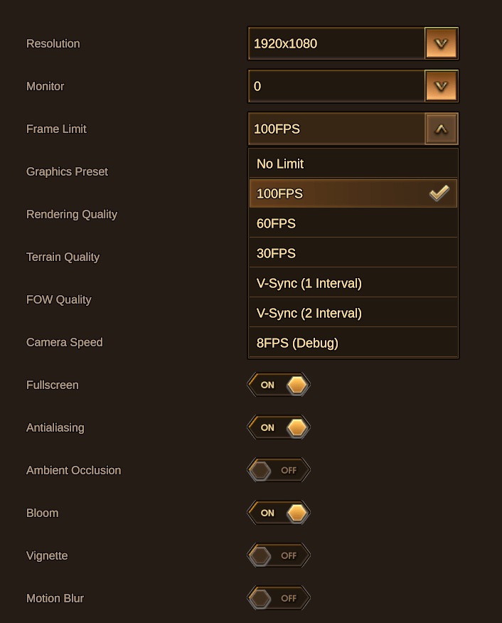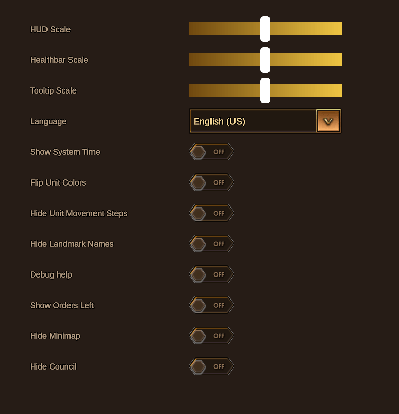 Når det kommer til grafikk, så er ikke Old World spillet du åpner for å se noe som blåser deg av banen. Grafikken er som å se Civilization V med litt annen fargepallett, og selv på høyt grafikknivå er det ikke særlig å rope hurra for. Men om du er som meg, så kom du ikke til strategisjangeren for grafikken, så lenge den er funksjonell og grei nok å se på. Og det vil jeg påstå at den er. Så lenge du ikke setter innstillingene på de to laveste innstillingene. Da er det en utrolig stygg grøt. Her kan du se ulike innstillingsmuligheter: