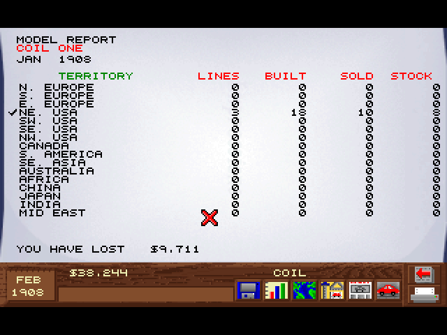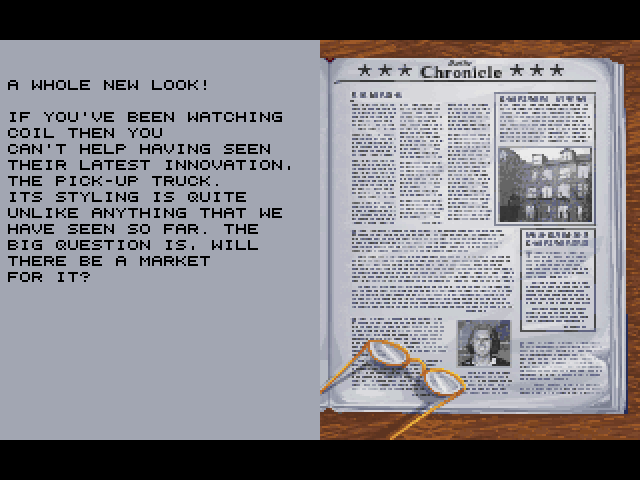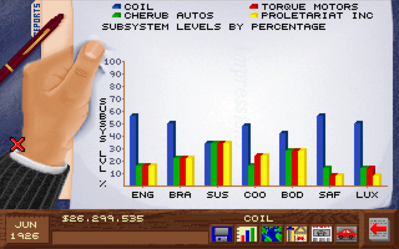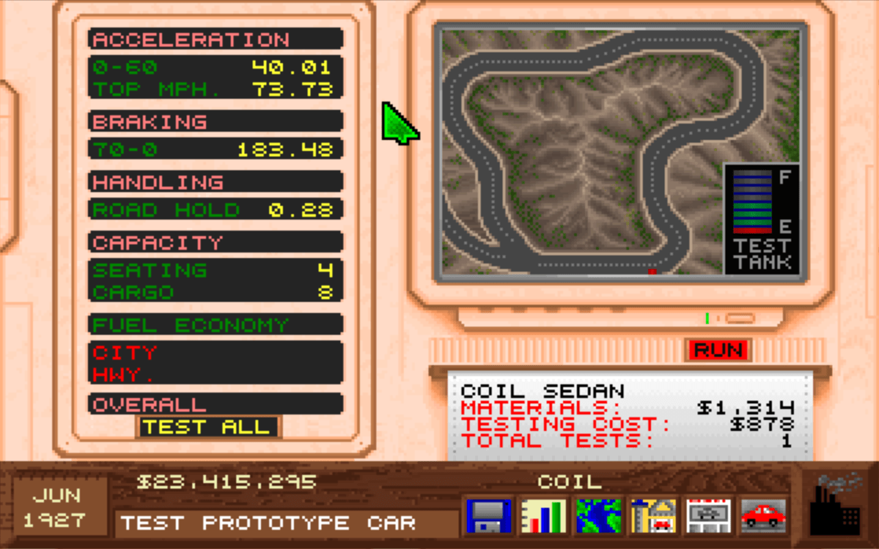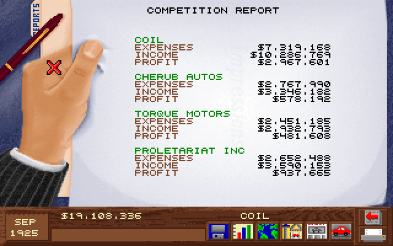 Spillet gir deg forresten masse statistikker og nyttige oversikter som du vil trenge for å optimalisere produksjon og salg. Og ved å lese hva avisene sier om bilene dine (og konkurrentenes), kan du få nyttige tips til hva du burde forbedre på bilene dine. «UNSAFE AT ANY SPEED» var ett av punktene som avisa trakk fram om den nye familiebilen min. Ehm. Kanskje ikke akkurat det beste salgsargumentet…