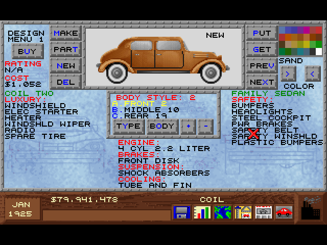 Et av de spillene jeg minnes best fra 90-tallet er Detroit, en business-simulator der du starter ditt eget bilfirma tidlig på 1900-tallet. I begynnelsen designer man sine egne biler slik de var for over 100 år siden, og ettersom tiden går forsker man fram nye deler og karosserier for å kunne holde tritt med konkurrentene, helt fram til dagens era. Her følger et lite tilbakeblikk.
