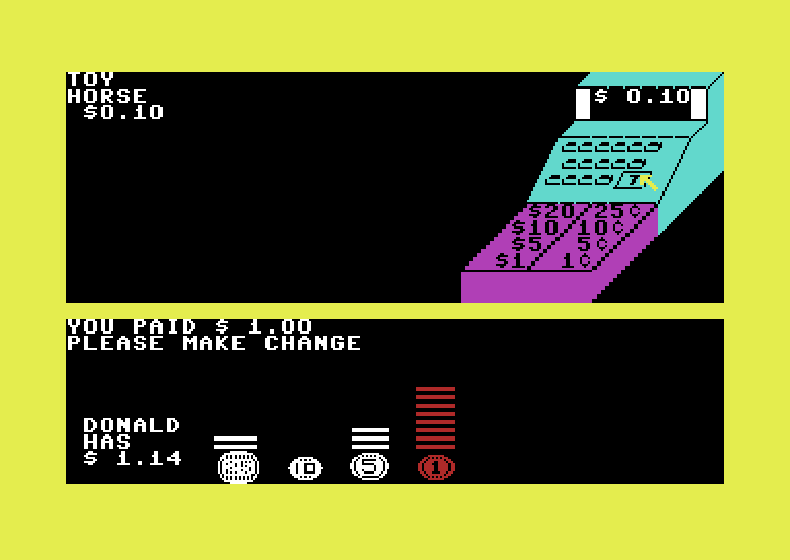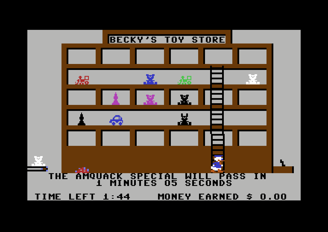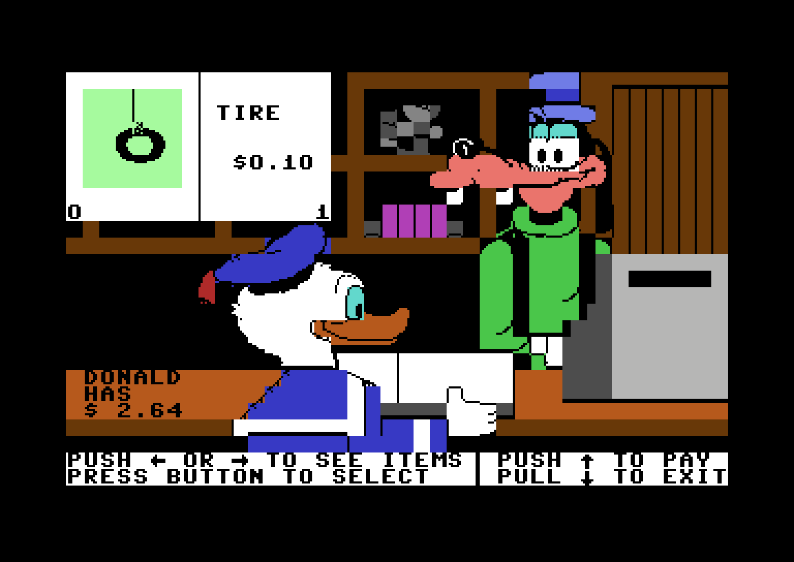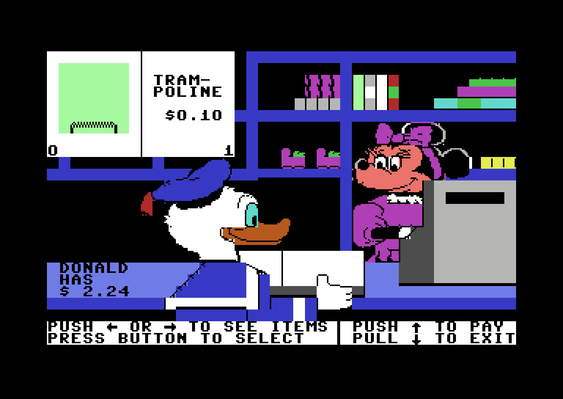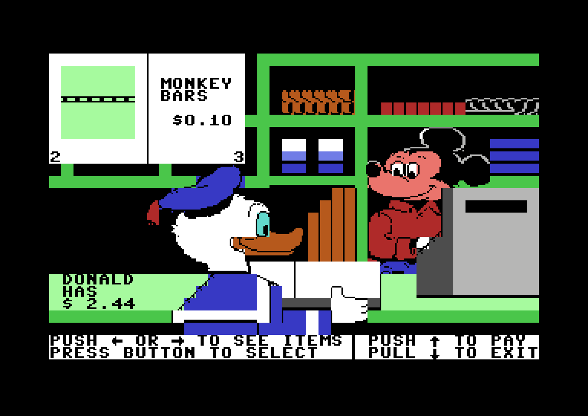 Etter å ha tjent noen penger kan Donald gå over i en av flere forskjellige butikker, der kjente fjes fra Andeby selger ulike installasjoner til lekeplassen. Disse har forskjellig pris, og spilleren må selv plukke ut hvilke mynter og sedler som skal gis i kassa (og eventuelt veksle om nødvendig).