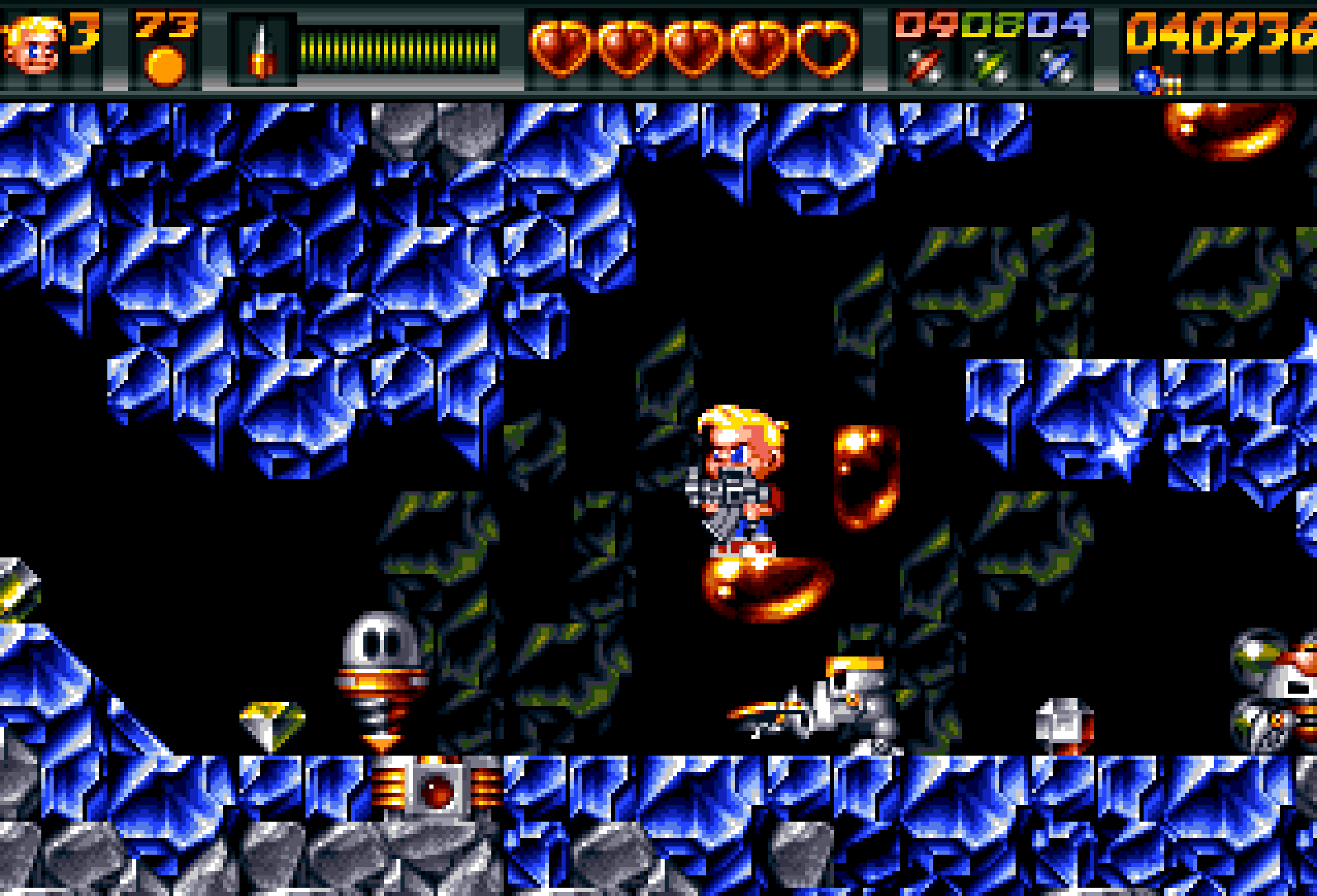 Hvert brett har også rikelig med fiender, som Ruff kan ta knekken på ved hjelp av maskinpistolen eller et annet våpen. Spillet har et ganske interessant våpensystem der du kan plukke opp alternative (og bedre) våpen som laserkanoner, flammekastere og rakettkastere underveis, men disse er kun tilgjengelige så lenge du har energien du trenger for å avfyre dem. Energien forsvinner gradvis, men du kan plukke opp ekstra i form av svevende bonuskuler rundt om på brettet, og dermed utsette returen til den enkle maskinpistolen.