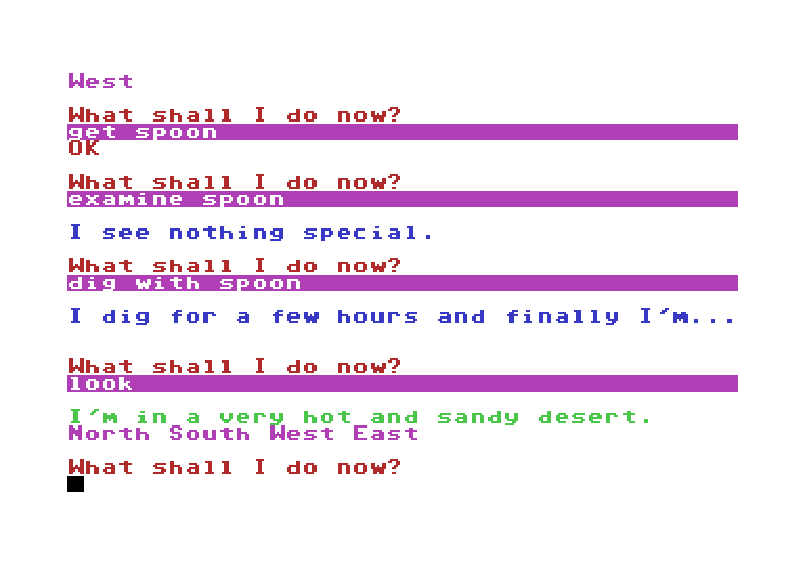 Dette spillet er faktisk skrevet i BASIC, så i teorien kan jeg gå gjennom koden for å lete etter løsningen, men det orker jeg ikke. Der de to forrige teksteventyrene begge hadde noe som gjorde dem interessante, er dette bare den typen spill det fantes cirka ti tusen av. Du får heller bare rope ut om du syntes dette er en skjult perle som fortjener et dypdykk.