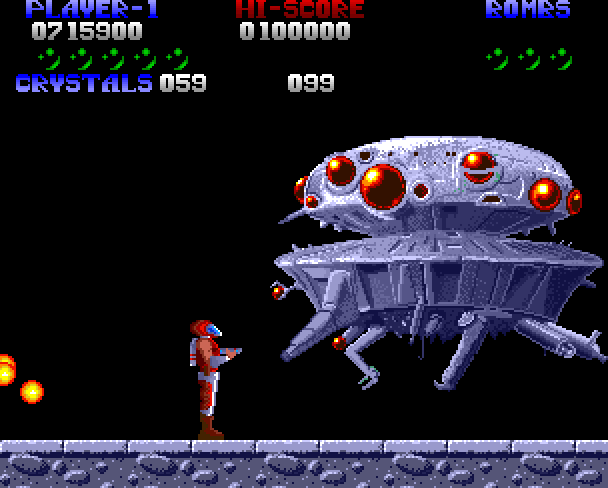 New Lines andre spill kom i 1990, og når jeg tester dette opplever jeg det umiddelbart som langt mer interessant enn Aladdin’s Magic Lamp. Plexu: The Time Travellers er et sideskrollende actionspill der du styrer det jeg antar er tittelhelten Plexu rundt i store nivåer fulle av ulike typer monstre som vil ham vondt. Grafikken er mye mer spennende enn i Aladdin’s Magic Lamp, med store og animerte figurer og massevis av bakgrunnselementer, og variasjonen er stor. Musikken er også temmelig kul – den er faktisk laget av britiske Allister Brimble, som ble en anerkjent spillmusikkskaper etter hvert.