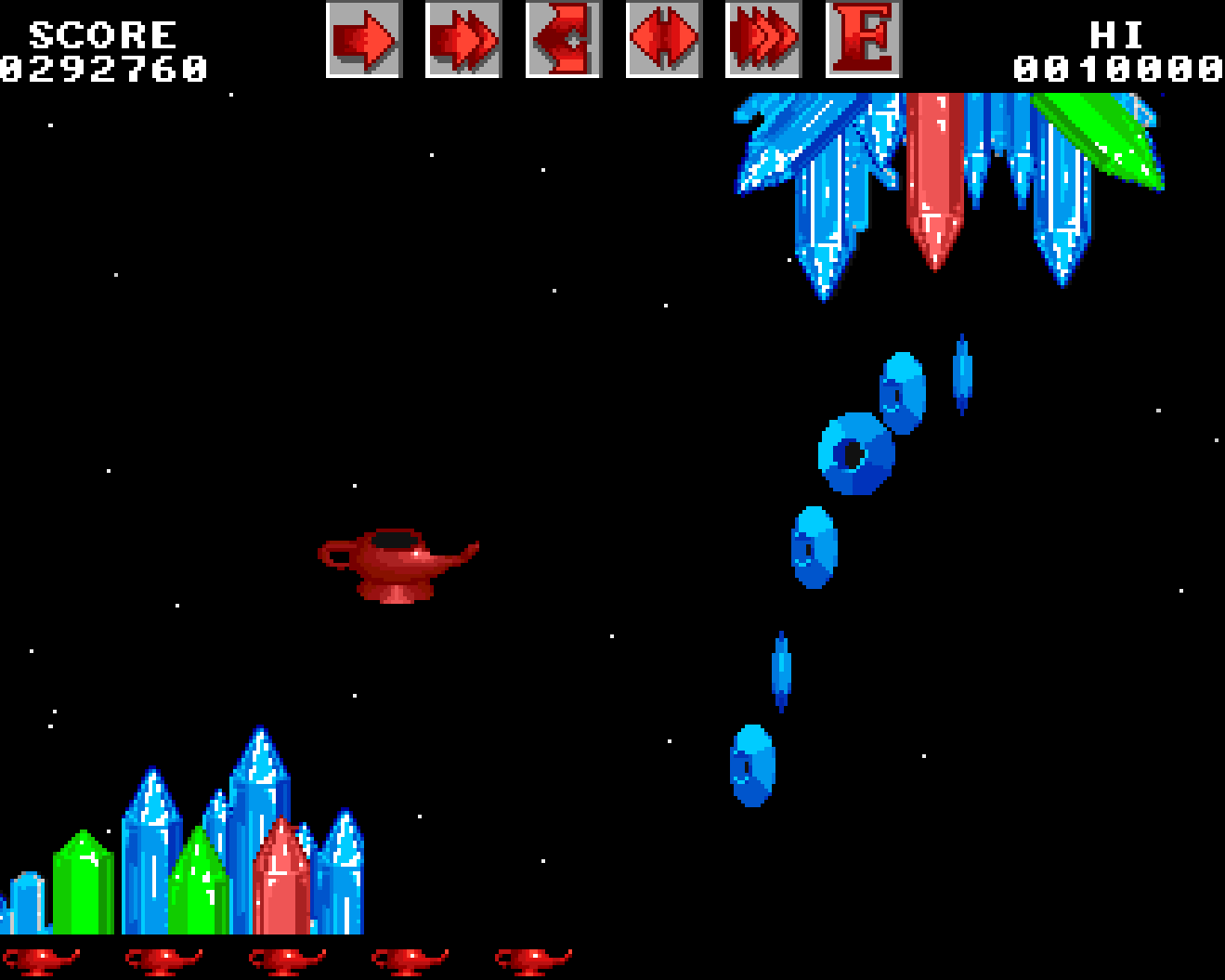 Aladdin’s Magic Lamp er et sideskrollende romskytespill i klassisk arkadespillstil, der du i stedet for å styre et romskip får kontroll over den magiske lampen til Aladdin. Målet er å kjempe seg gjennom fem store verdener for å redde prinsessen fra den onde trollmannen, skjønt utenom lampen og muligens «sistebossen» (som enten er en slags nisse eller trollmannen selv) er det ingenting i spillet som minner om eventyret. Omgivelsene er pene, men generiske, og i stedet for å være inspirert av eventyret består fiendene av alt fra romskip til gigantiske molekyler og svirrende hoder med solbriller på.