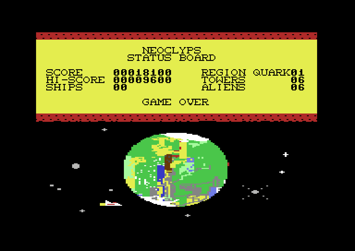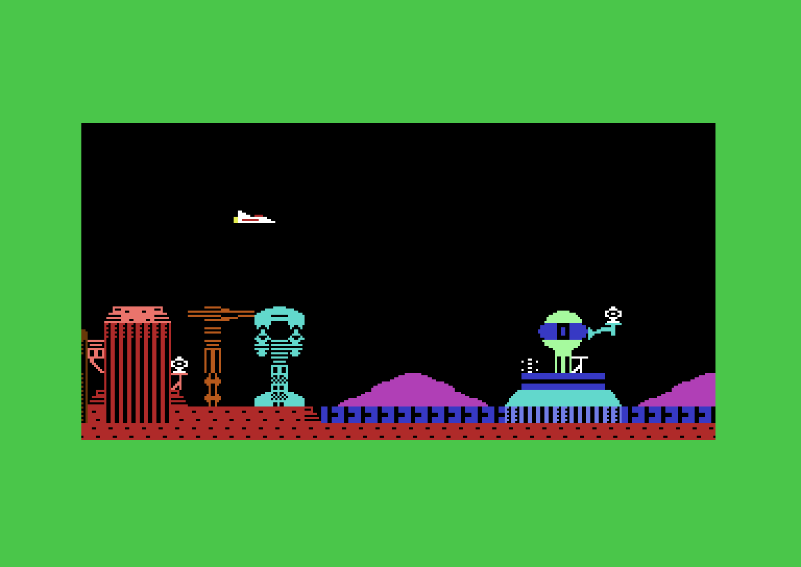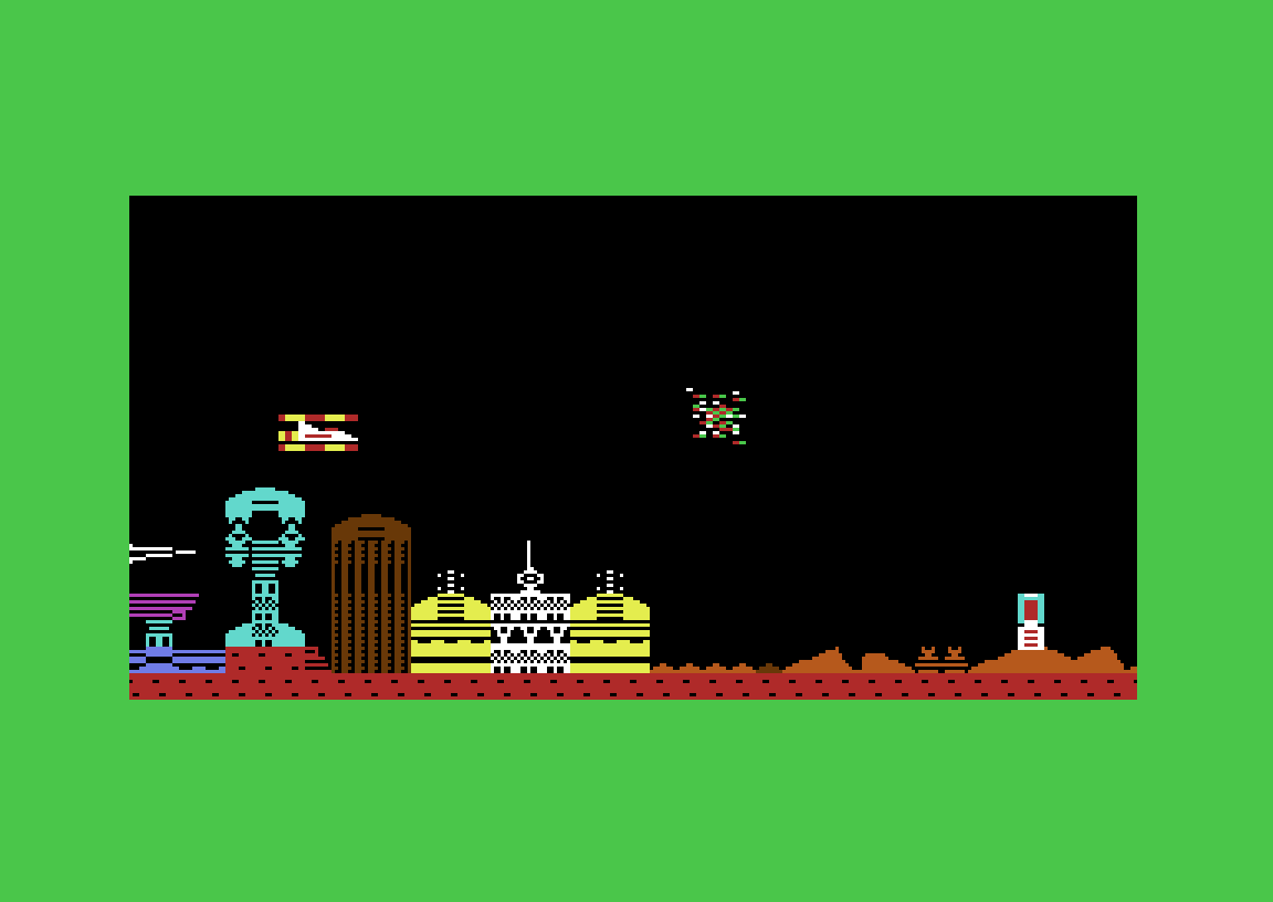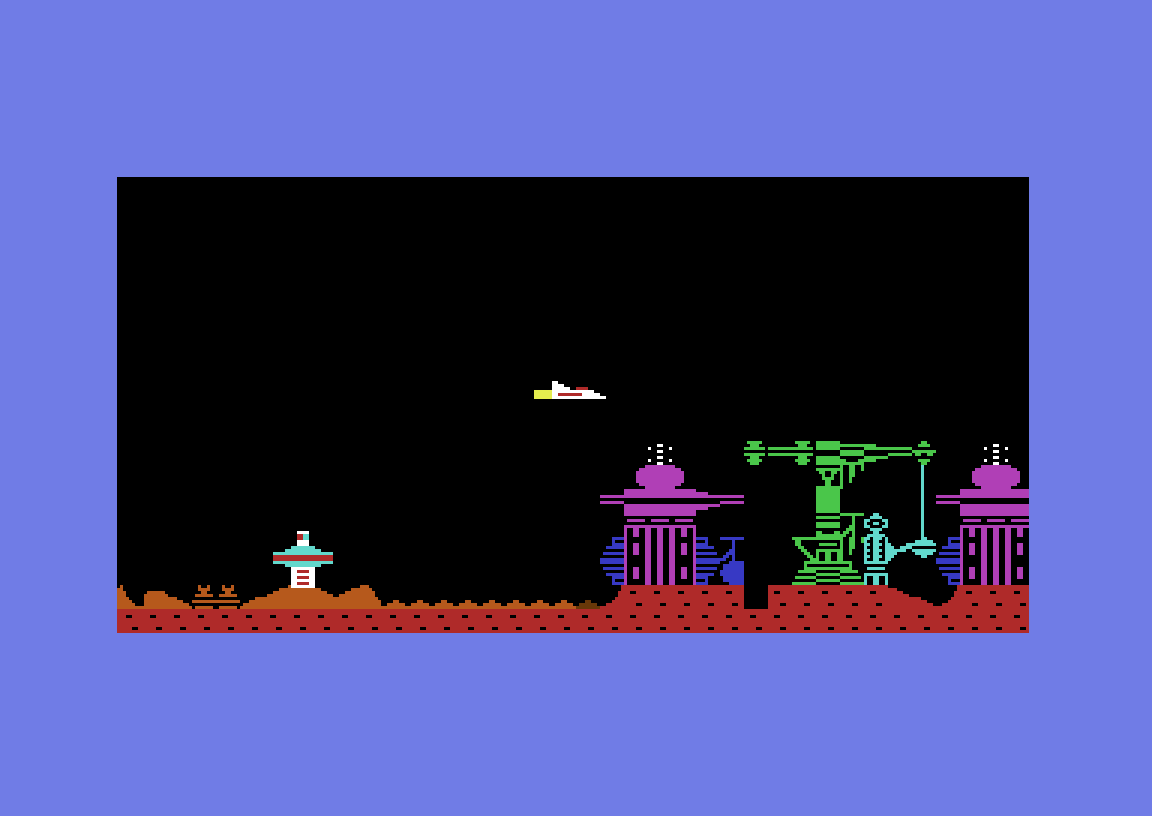 Hm, dette er et interesant lite spill. Det er et sideskrollende romskytespill åpenbart inspirert av Defender, men det føles ganske annerledes. De fleste fiendene dukker opp i nærheten av tårn som må skytes. Når du skyter en fiende vil du i en kort stund være usårbar, slik at du ikke trenger å være redd for å kollidere i bygningene, og det dermed blir langt lettere å fly ned på bakkenivå for å ta ut det aktuelle tårnet. Du må imidlertid fortsatt unngå å krasje i fiendene. På høyere vanskelighetsgrader får du ekstra utfordringer, som raketter som skytes opp fra bakken.