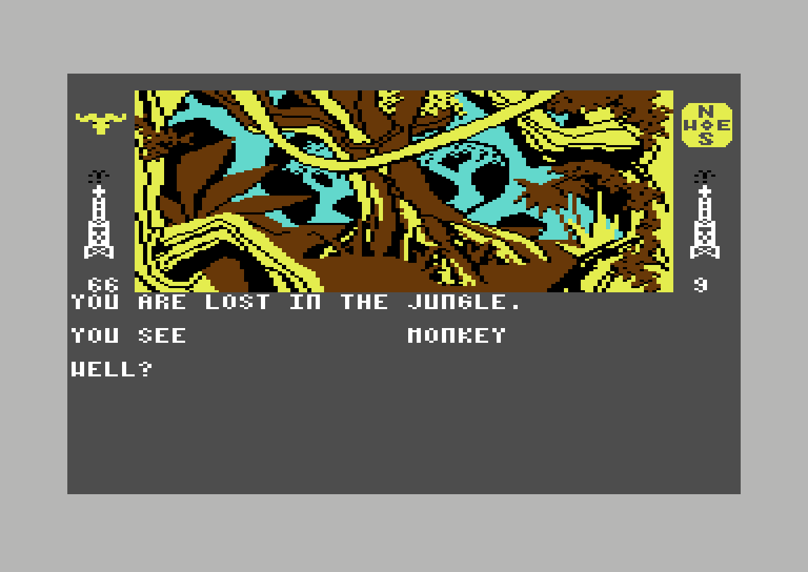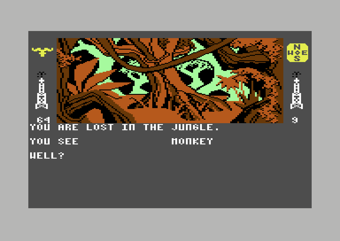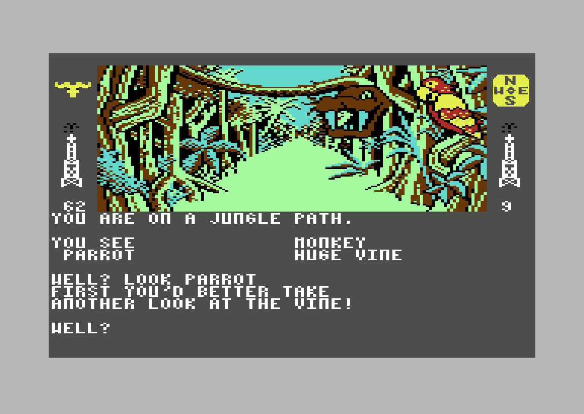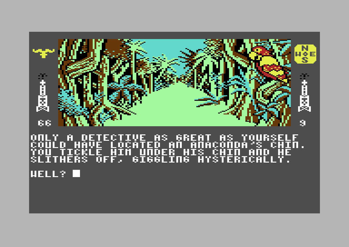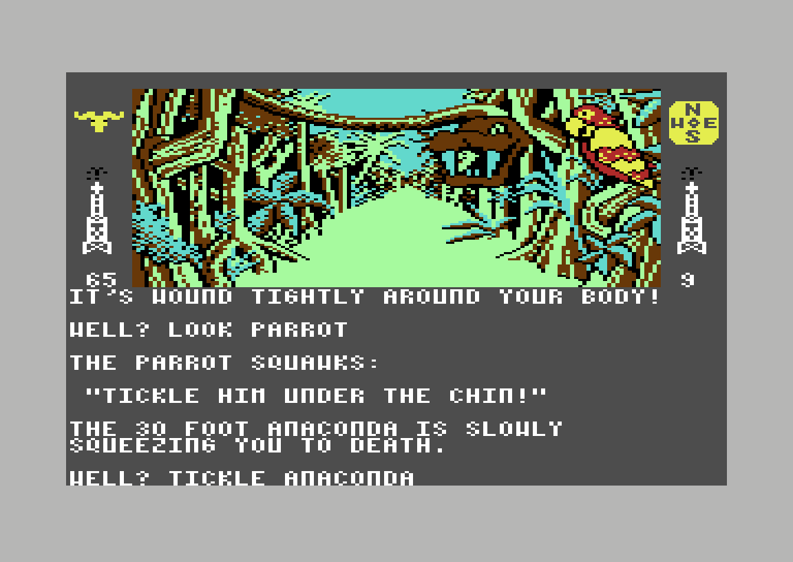 Det viser seg at både øst og vest tar meg til samme skjebne, men går jeg sørover kommer jeg ut på en vei. Igjen kan jeg gå i alle retninger, men den eneste som hjelper meg videre er sør. Her treffer jeg på en papegøye, og får også beskjed om at det er en svær liane i nærheten. Jeg prøver å titte på papegøyen, men får i stedet beskjed om at jeg burde ta en titt på lianen. En liten endring i skjermbildet forteller hvorfor; det er ikke en liane, det er en slange. En gigantisk anaconda, for å være eksakt, og den har allerede klart å sno seg rundt meg. Spillet gir meg som vanlig noen turer med eksperimentering før jeg blir slukt. Skjønt det eneste jeg lærte er at det ikke nytter å prøve å slå den svære kvelerslangen.