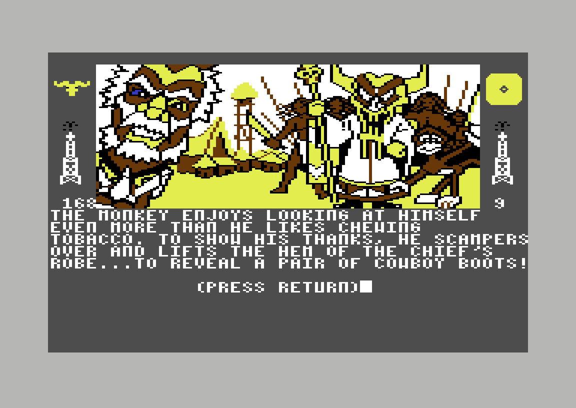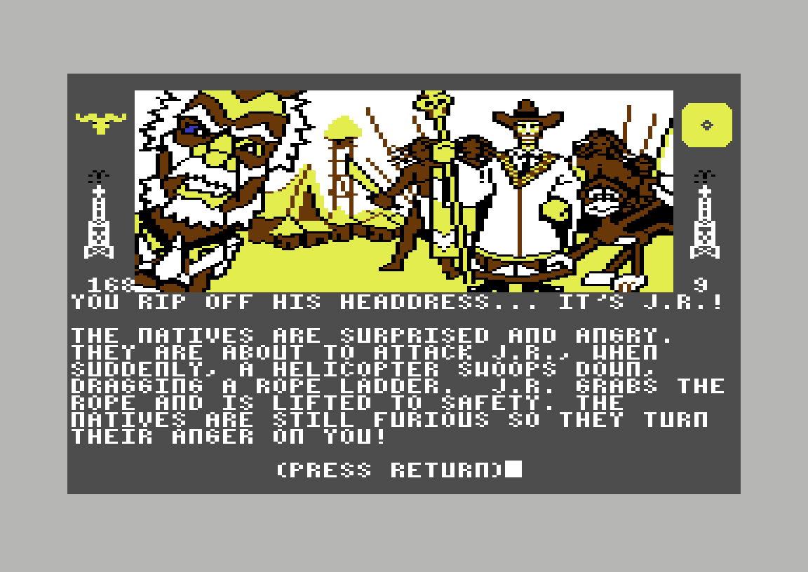 Vel fremme får jeg uansett beskjed om at høvdingen fortsatt er skeptisk, og krever å få se ringen jeg fikk av Sue Ellen i starten av spillet. Dette er visstnok litt rart, for ifølge spillfiguren er Sue Ellen og J.R. de eneste som vet om nevnte ring. Å vise ringen resulterer i at høvdingen snapper den, og plutselig er det «game over». Jeg må innrømme at jeg gir litt opp her, og søker «walkthrough»-hjelp (jeg har spilt spillet i hele dag, nå er jeg klar for å bli ferdig). Løsningen hadde jeg ikke kommet på uansett; den er å gi speilet som jeg fant i butikken til apekatten, som blir supertakknemlig og løfter opp kjortelen til høvdingen for å vise alle at han har cowboystøvler på.