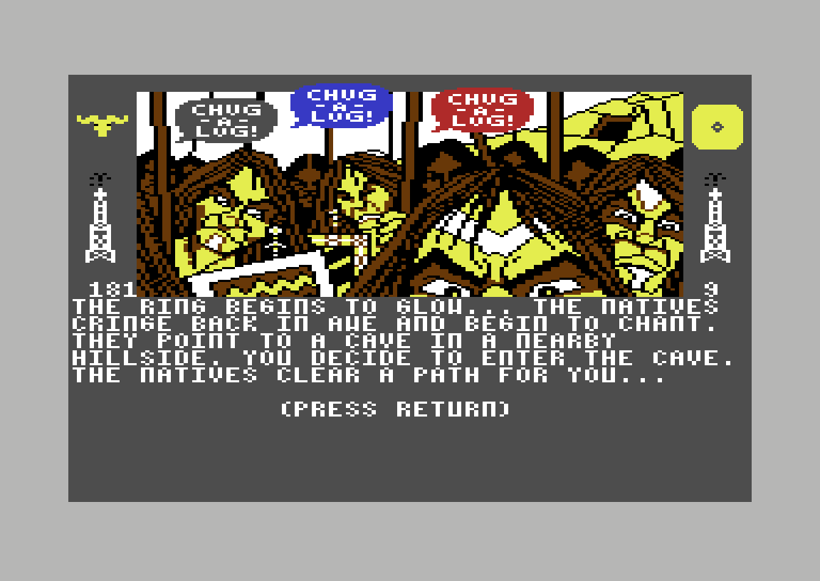 Når jeg ankommer kannibalenes landsby, vil de selvsagt spise meg. Spesielt ivrig virker høvdingen, som har maske på. Men jeg, eller strengt tatt spillfiguren, legger merke til en totempåle som ligner litt på Chugalug Jones. Jeg trodde totempåler var en Nord-Amerikansk greie, men jeg trodde jo også at flodhester var afrikanske, så hva vet jeg? Jeg viser dem uansett fotoet av Chugalug, og får betalt for at jeg har drasset på det i stedet for tilsynelatende mer nyttige ting (som 500 000 dollar).