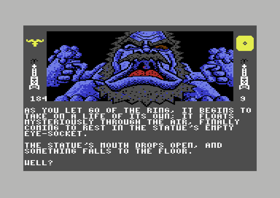 Neste rom inneholder ei svær statue av Chugalug, som kannibalene altså tror er en gud. Og jeg begynner å lure, jeg også. Statuen mangler nemlig et øye, og når jeg prøver å legge ringen der svever den på magisk vis inn i øyehulen, med det resultatet at statuen åpner munnen sin og slipper ut kartet hele eventyret har handlet om å få tak i. Det neste som skjer er selvsagt at J.R. på like magisk vis dukker opp, og tilbyr meg ti millioner dollar for å gi ham kartet. Om jeg skulle gå med på dette, vil han trekke i en spake som åpner en fall-lem under meg, og slik at jeg stuper ned i et rom fullt av slanger. Hvordan har J.R. funnet ut av alt dette, egentlig?
