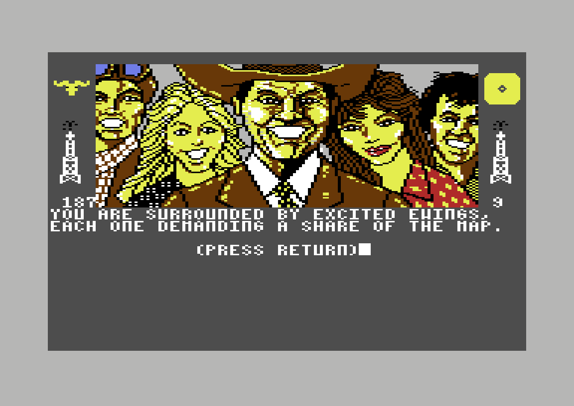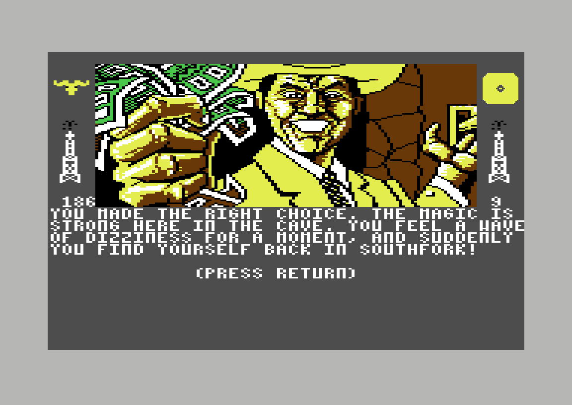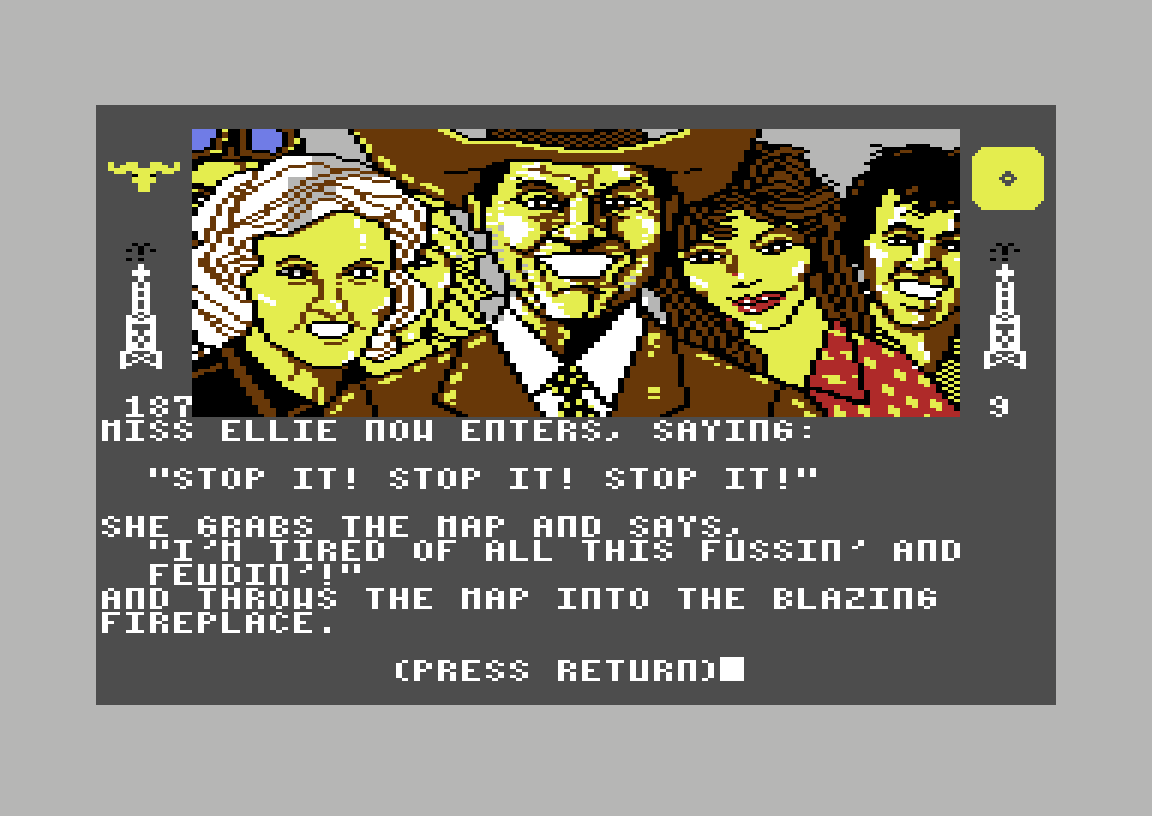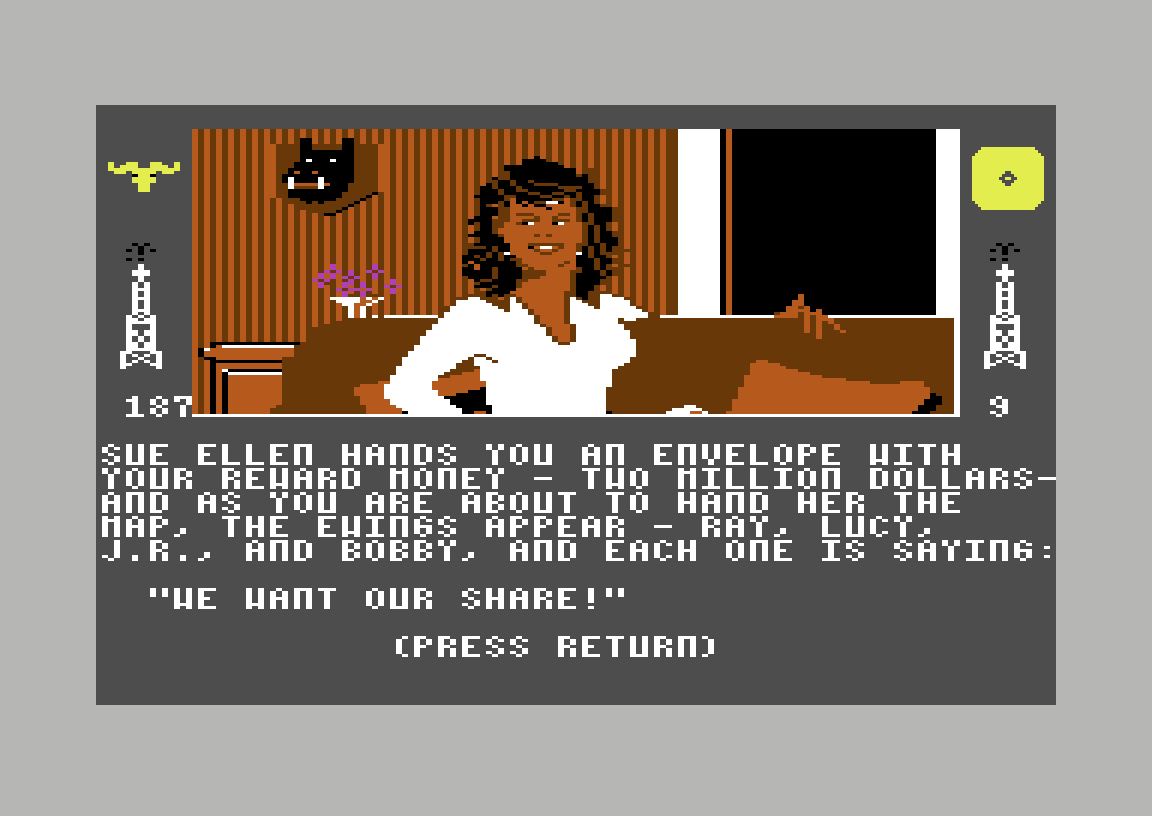 Uansett, nei er selvsagt det korrekte svaret. Det resulterer i at jeg teleporteres tilbake til farmen. Ja, det er ren magi. «The magic is strong here», sier det offisielle dataspillet basert på såpeoperaen Dallas. Jeg gir kartet til Sue Ellen, og får to millioner dollar som belønning. Så kommer J.R. inn i rommet (ble han også teleportert?), sammen med resten av familien, og alle begynner å mase om kartet. Det hele ender med at familiens matriark, som jeg har glemt navnet på, grabber det og kaster det i ovnen slik at det brenner opp, fordi hun er lei av all kranglingen.