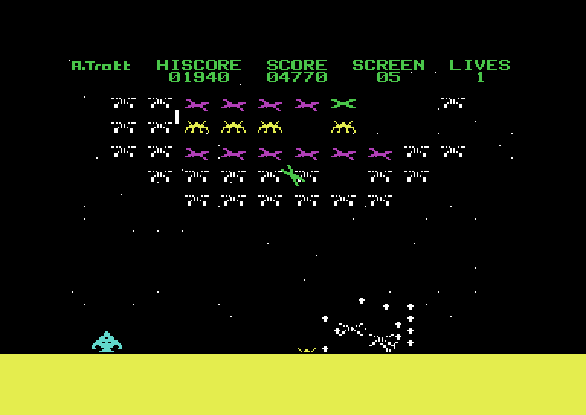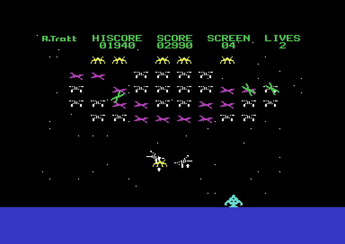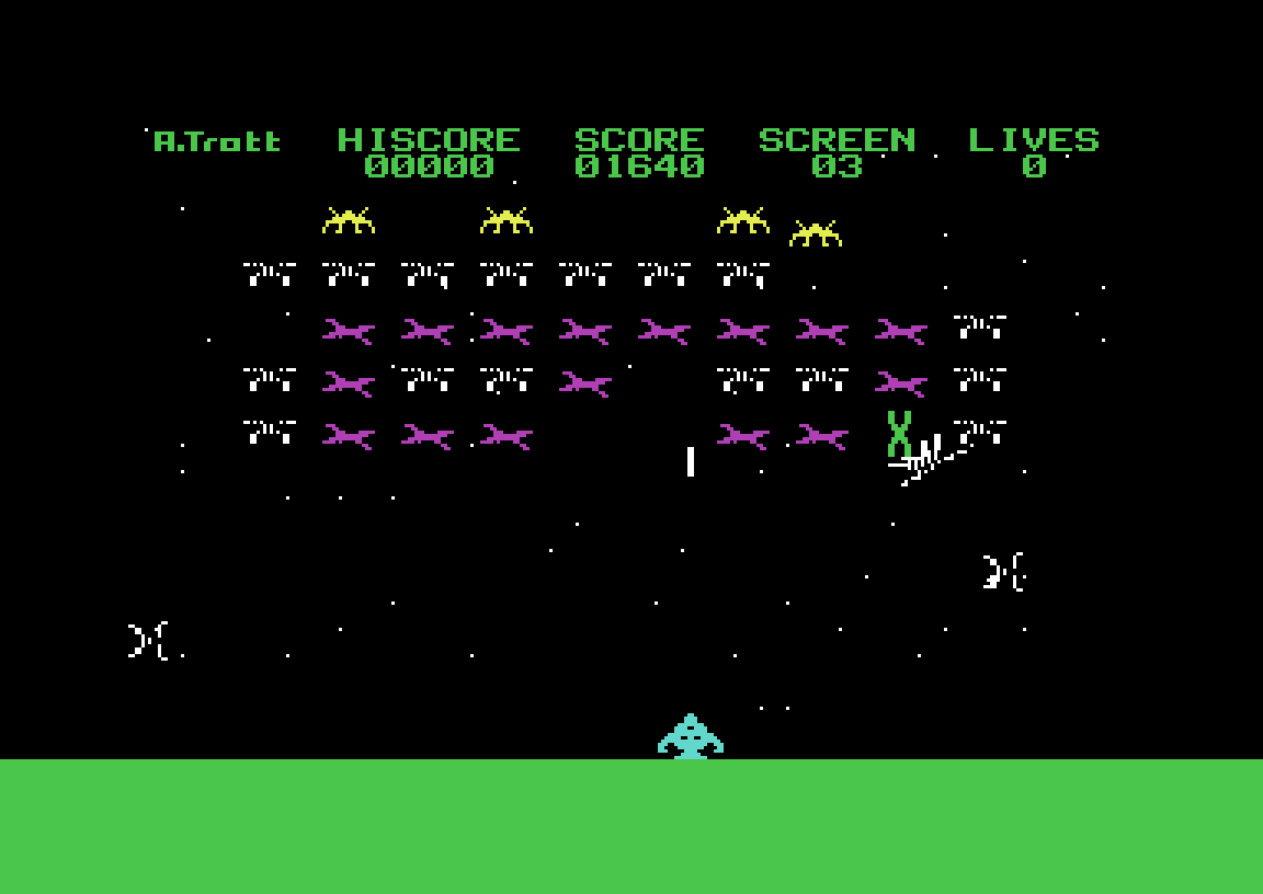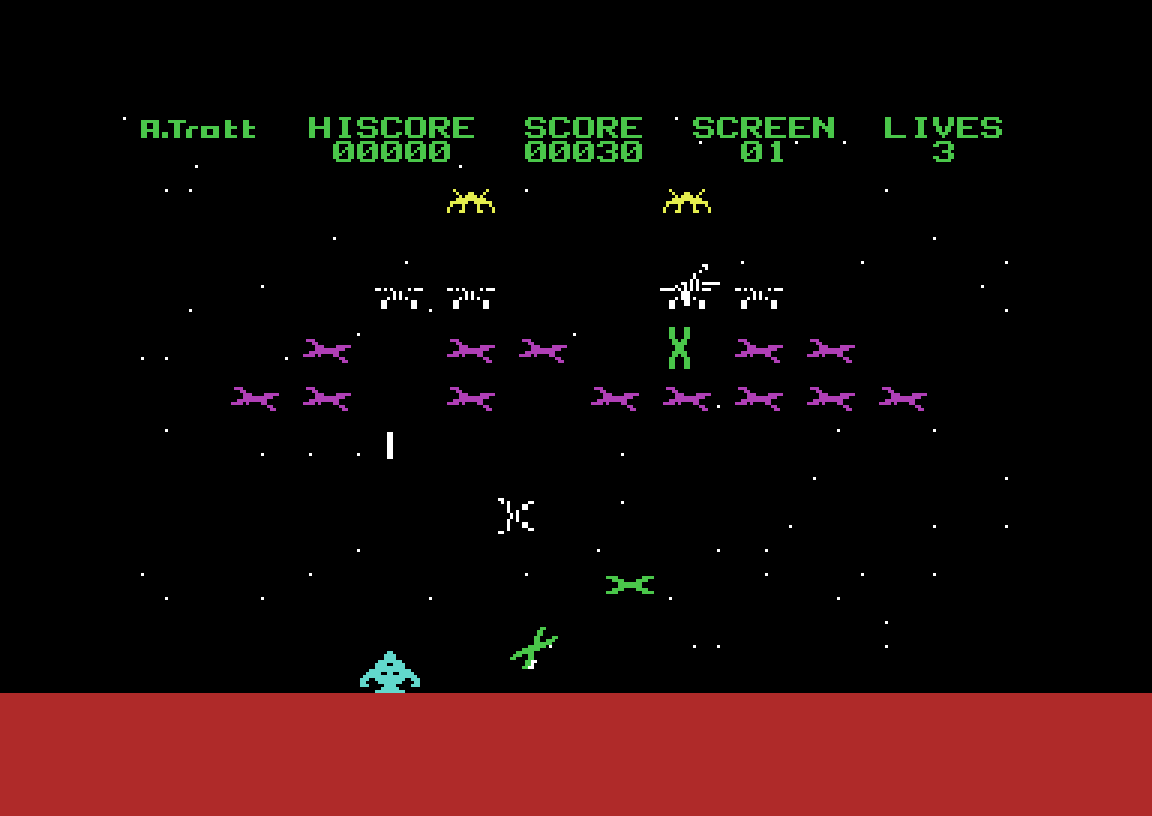 Ohoi, dette var litt artig. Xerons er et enkelt Galaxian-inspirert skytespill, men det som gjorde at det umiddelbart fanget oppmerksomheten min var at det er laget av en viss A. Trott. Det er samme person som har laget et av favorittspillene mine på Commodore 64, Stix.
