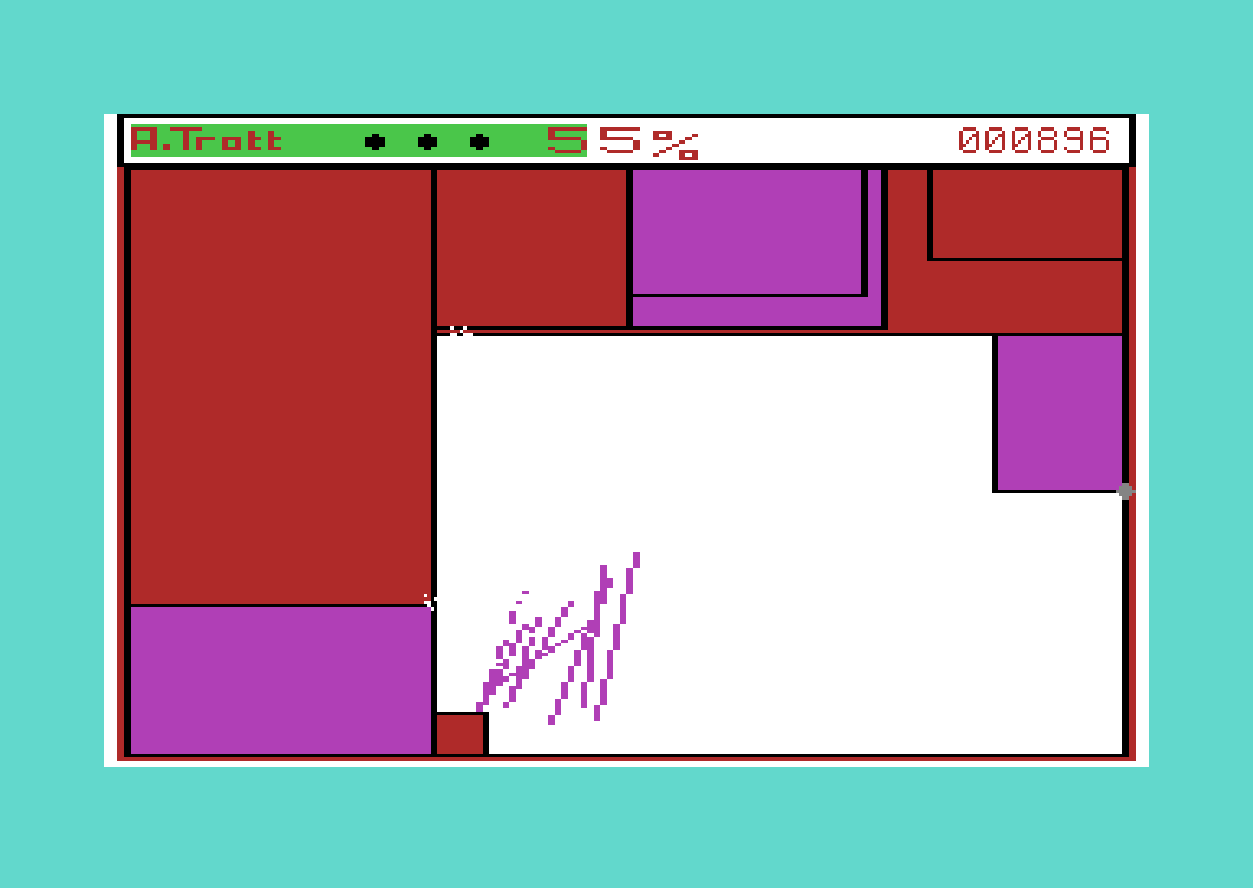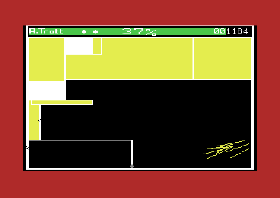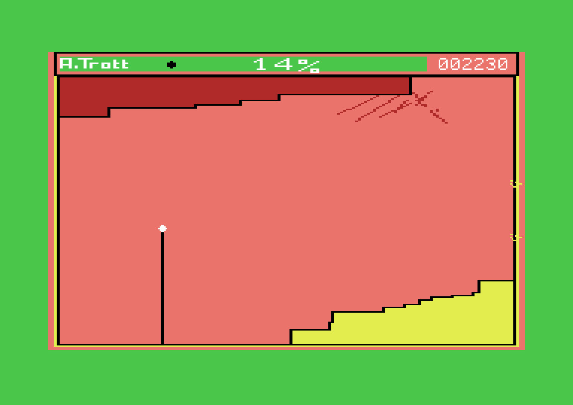 Okay, nå føler jeg meg litt smålig for kommentarene om tittelskjerm i sted, for Qix-klonen Stix er et av favorittspillene mine, og det har ikke tittelskjerm engang. I stedet står bare skaperens navn på statuslinjen i toppen av skjermen.