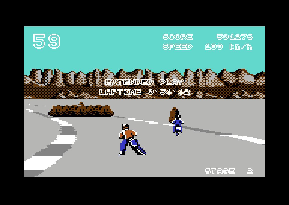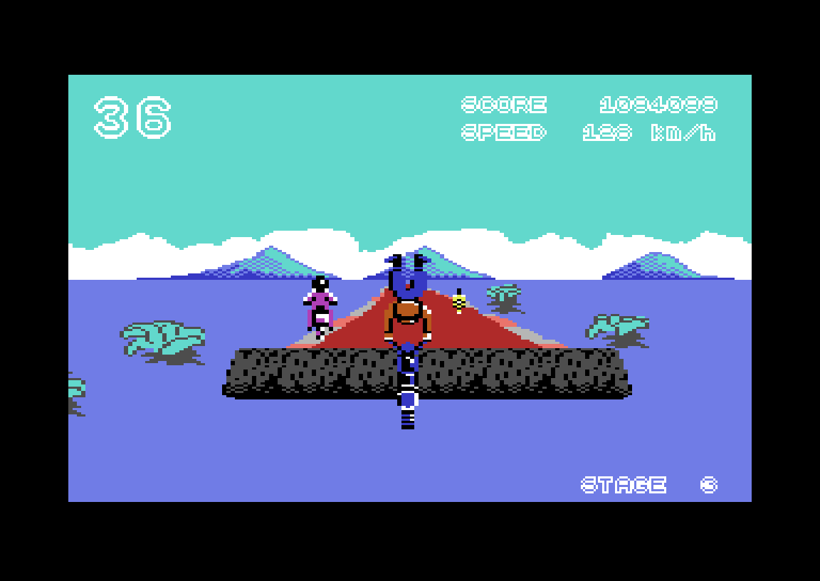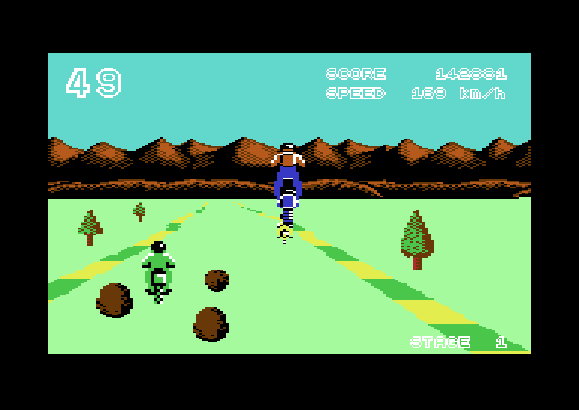 Banen har også massevis av hopp, og ikke bare har du null kontroll over sykkelen i lufta, men også lenge etter at du har landet. I arkadeversjonen skal man kunne forhindre dette ved å lene figuren forover før man lander, men jeg får ikke det til på Commodore 64. Rett etter hoppene er det typisk også massevis av kampesteiner og det er fint lite du kan gjøre hvis du er på vei til å lande på en slik.