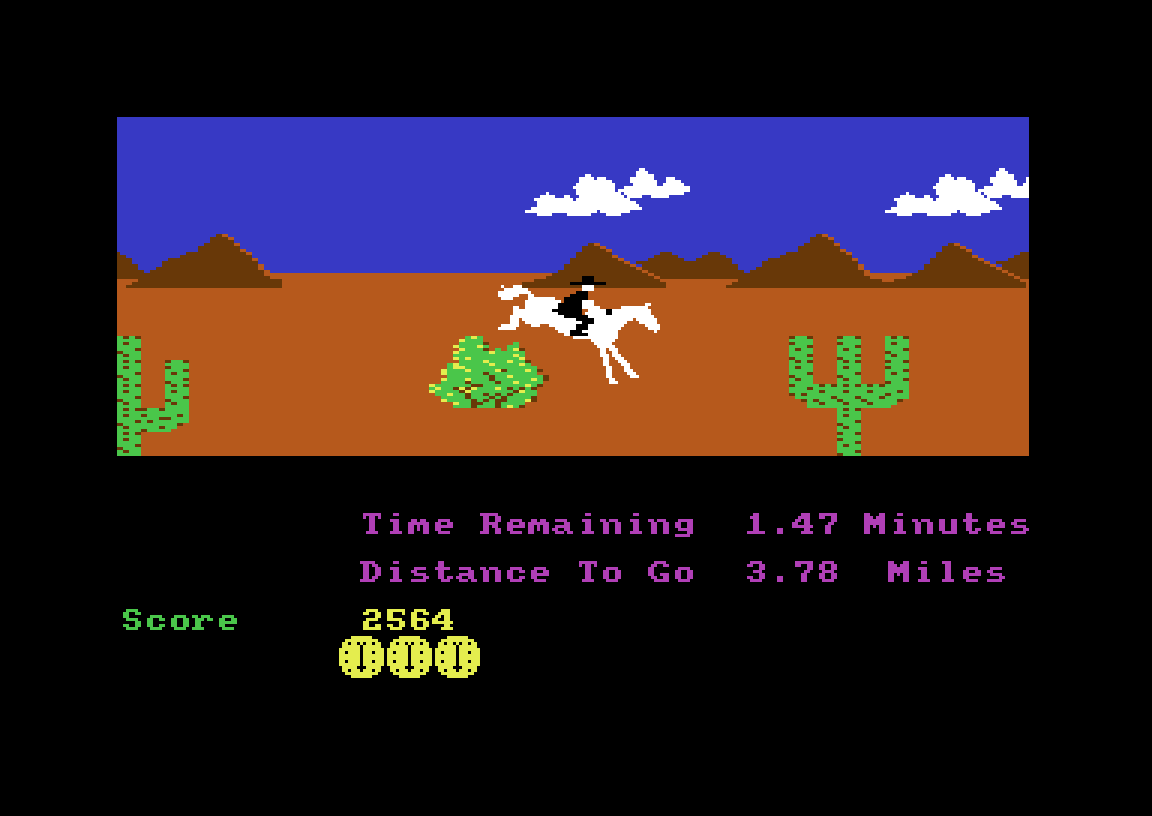 Minispillene i Kane er enkle, men de fungerer egentlig ganske greit. Grafikken er pen, skjønt det virker som utviklerne har rappet løpeanimasjonen til helten i Impossible Mission (jeg føler også at jeg kjenner hesten igjen – C64Wiki hevder den er tjuvlånt fra Harvey Smith Showjumper, et spill jeg aldri har spilt). Spillet får bonuspoeng for å inkludere muligheten til å øve på de ulike sekvensene. Så er det samtidig litt irriterende at pila av og til går rett gjennom fugler uten å treffe dem. Skytesekvensen i byen er vel den jeg liker best.
