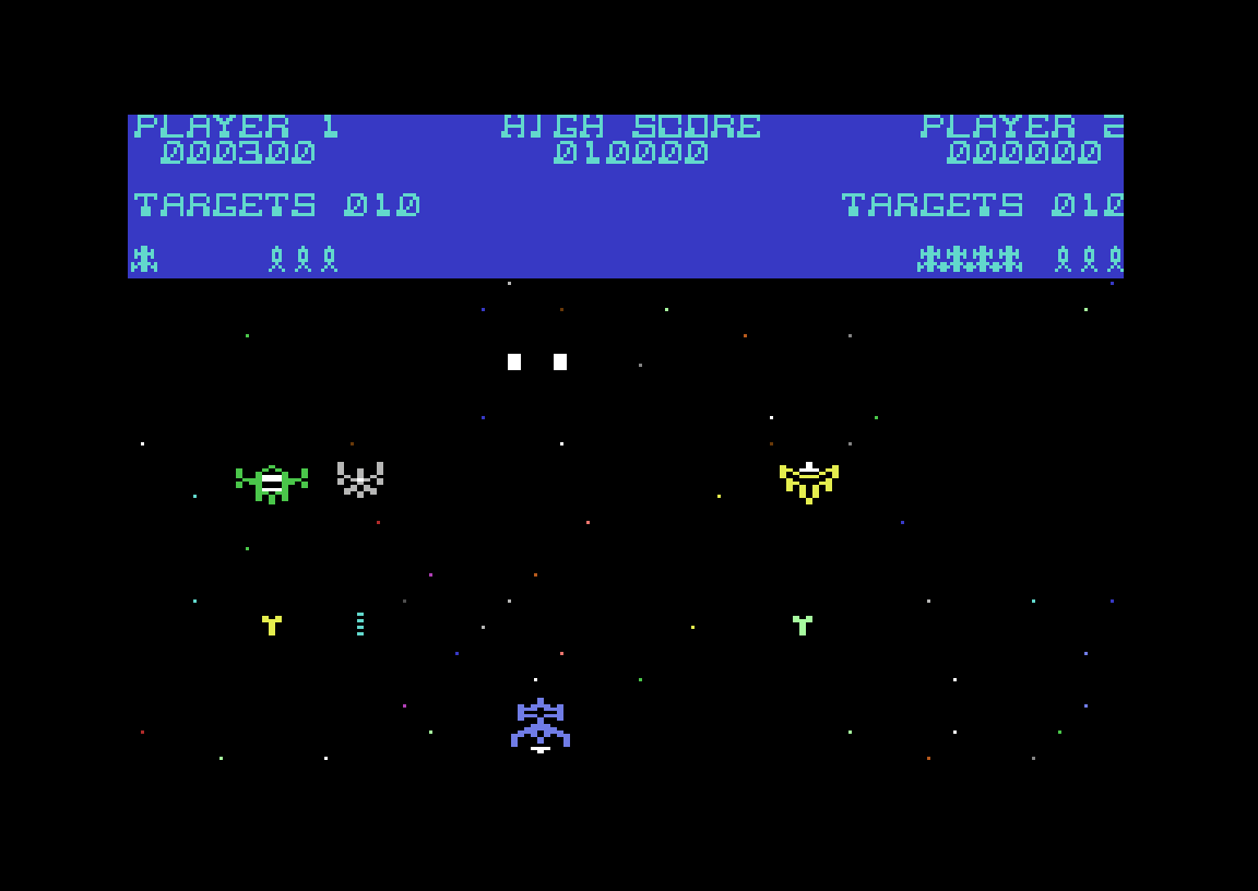 Det neste brettet har skrollende stjerner i bakgrunnen, og mer tradisjonelle romfiender som sender bomber nedover. De er egentlig trivielle å ta ut, siden de aldri beveger seg fra side til side, og dine skudd dekker et bredere område av skjermen enn deres. Så er vi tilbake på bakkenivå igjen, riktignok med en annen bakgrunn. Her byttes flyet ut med en fiende som har en irriterende missil som oppsøker deg, og egentlig ble dette brettet for vanskelig. Men takket være litt juks fant jeg også ut at spillet har et fjerde brett (Phase 4, antar jeg), som er en enkel, sideskrollende greie.