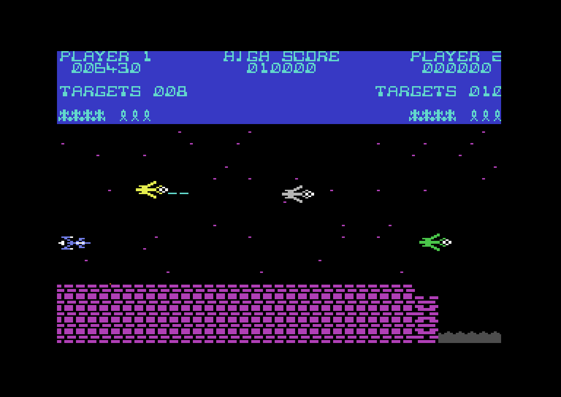 Det er veldig hektisk, og veldig lett å miste liv, men «løsningen» på første brett viser seg å hele tiden holde seg på venstre side av skjermen slik at du kan ta ut den første av de nevnte fiendene med en gang den kommer inn på spillområdet. Dermed får den aldri tid til å plage deg, og det blir langt enklere å overleve angrepene fra de to andre.